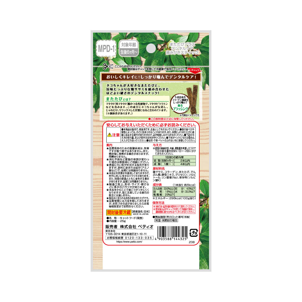 ネコちゃんの大好きなまたたびプラス!おいしくキレイに!しっかり噛んでデンタルケア!本商品は猫用で、間食用です。主食として与えないでください。猫の食べ方や習性によっては、のどに詰まらせることがあります。また、体質によりまたたびに過敏に反応する場合がありますので、必ず観察しながらお与えください。本商品は猫用で、間食用です。主食として与えないでください。猫の食べ方や習性によっては、のどに詰まらせることがあります。また、体質によりまたたびに過敏に反応する場合がありますので、必ず観察しながらお与えください。別記の与え方の給与量、および保存方法をお守りください。子供がペットに与える場合は、大人が立ち会ってください。幼児子供ペットのふれない所に保管してください。