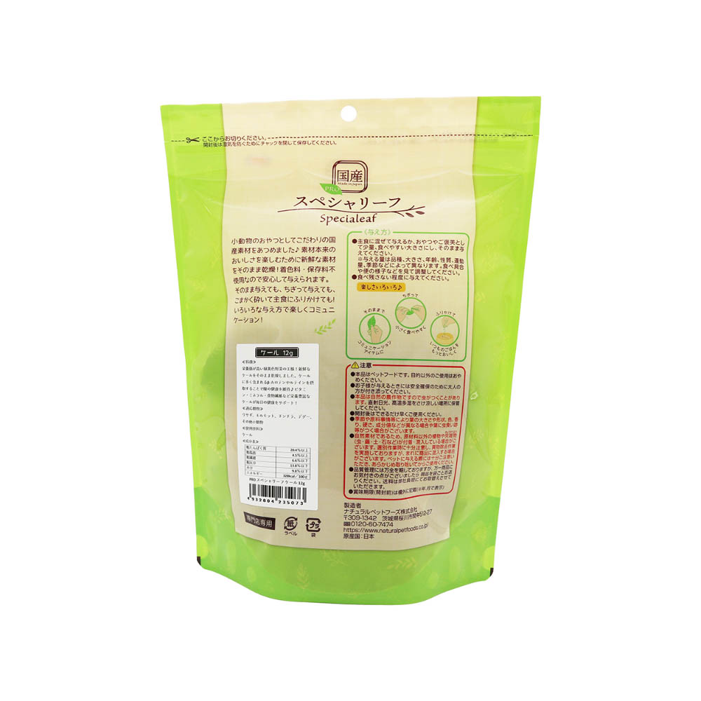 こだわりの国産素材。自然のおいしさをお届けします。栄養価が高い緑黄色野菜の王様!新鮮なケールをそのまま乾燥しました。ケールに多く含まれるβカロテンやルテインを摂取することで瞳の健康を維持♪ビタミン・ミネラル・食物繊維など栄養豊富なケールが毎日の健康をサポート!本品はペットフードです。目的以外のご使用はおやめください。お子様が与えるときには安全確保のために大人の方が付き添ってください。自然素材を使用しているため、季節や原料事情等により大きさや形状、色、香り、硬さ、成分値などが異なる場合や葉に虫食い跡等がつく場合がございます。自然素材であるため、原材料以外の植物や夾雑物(虫・繭・土・石など)が付着・混入している場合がございます。選別作業時に十分注意し、異物除去作業を実施しておりますが、まれに商品に混入する場合がございます。ペットに与える際には十分ご注意いただき、あらかじめ取り除いてからご使用ください。品質管理には万全を期しておりますが、万一商品にお気づきの点がございましたら現品を袋ごとお送りください。送料はメーカー負担にてお取替えさせていただきます。賞味期限(開封前)欄外に記載(年.月で表示)直射日光、高温多湿をさけ涼しい場所に保管してください。開封後はできるだけ早くご使用ください。