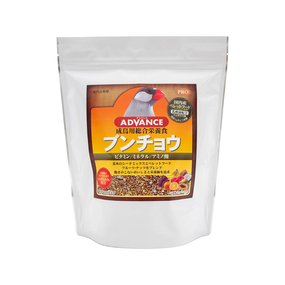 基本のシードミックスとペレットフード、フルーツ・ナッツをブレンド。飽きのこないおいしさと栄養価を追求したブンチョウのための総合栄養食。腸内環境を整え健康をサポートする乳酸菌(フェカリス菌)をペレットフードにプラス。鮮度を保つアルミパックを採用。本品はペットフードです。目的以外のご使用はおやめください。お子様が与えるときには安全確保のために大人の方が付き添ってください。季節や原料事情等により粒の大きさや形状、色合い、においなどが異なる場合がございますが、品質には問題ありません。本品は自然の農作物ですので虫がつくことがあります。自然素材を使用しているため、原材料由来等の夾雑物が混入する場合がございます。製造工程において選別除去作業等を行っておりますが、商品中に混入する場合がございます。ご使用の際には十分ご注意ください。品質管理には万全を期しておりますが、万一商品にお気づきの点がございましたら現品を袋ごとお送りください。送料はメーカー負担にてお取替えさせていただきます。直射日光や高温多湿をさけ涼しい場所に保管してください。また、開封後は密封容器等に移して保管し、なるべく早くご使用ください。