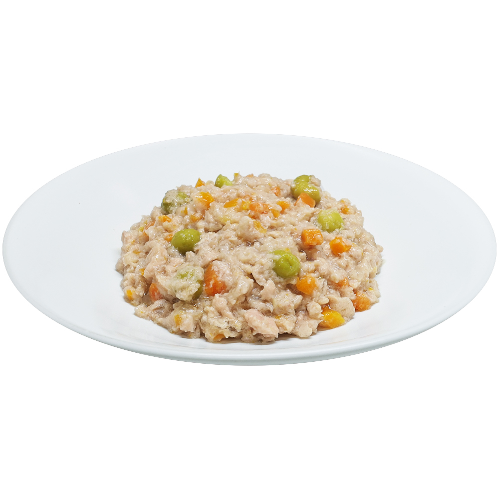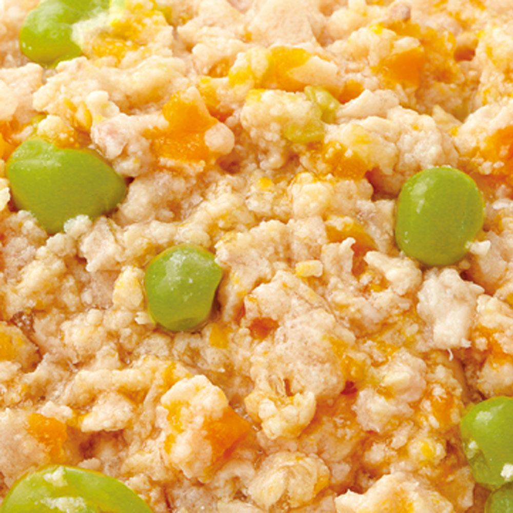 鶏ささみをベースに鶏レバーと鶏手羽を細かいミンチにし、野菜(人参、グリンピース)を加えました。オリゴ糖、EPA・DHA、グルコサミン・コンドロイチン、植物性乳酸菌K71、タウリン配合。