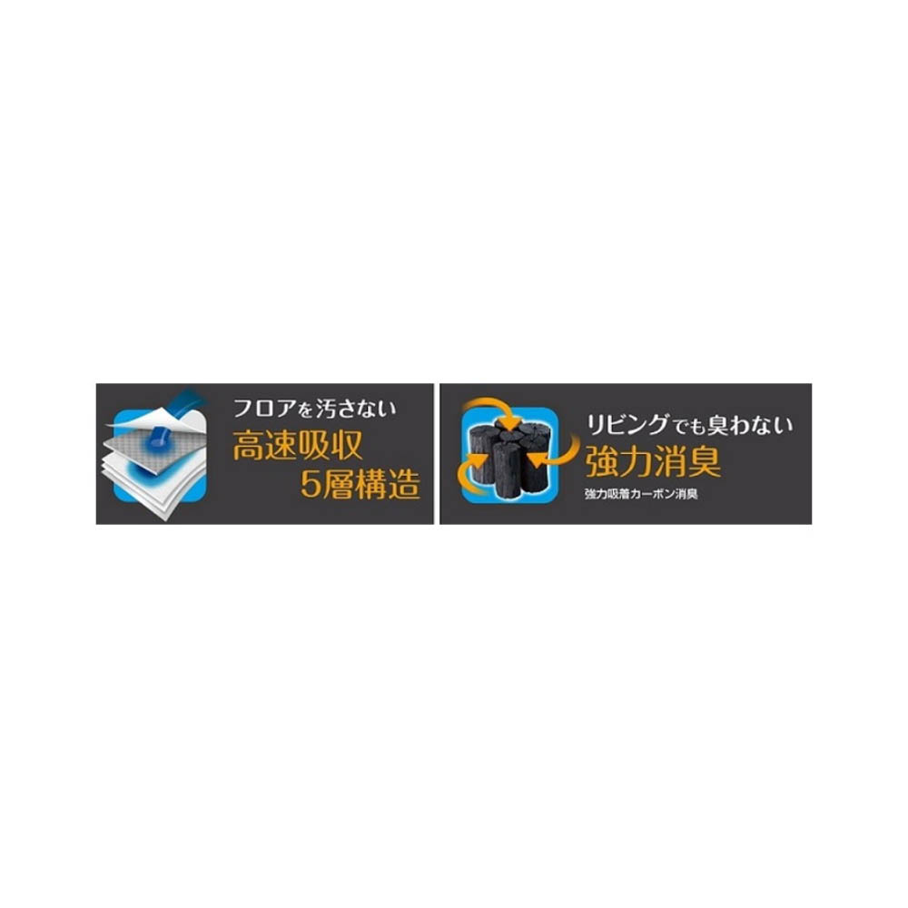 炭の吸着効果でストロング消臭使用中に破損・変形・劣化が見られた場合は、直ちに使用を中止してください。シーツを広げる際に、振って広げたり手荒に扱うと、破れて吸収体が飛び出したり、吸収体がかたよる原因となりますのでこ注意ください。ハサミ等で切らないでそのまま使用してください。吸収体が飛び散り、汚れや漏れの原因となります。グレーの面を下にして使用すると色落ちの可能性があります。必すグレーの面を上にして、使用してください。本品は食ぺられません。万が一、飲み込んでしまった場合や、目に入った場合は医師、獣医師に相識してください。空袋をおもちゃにしないでください。