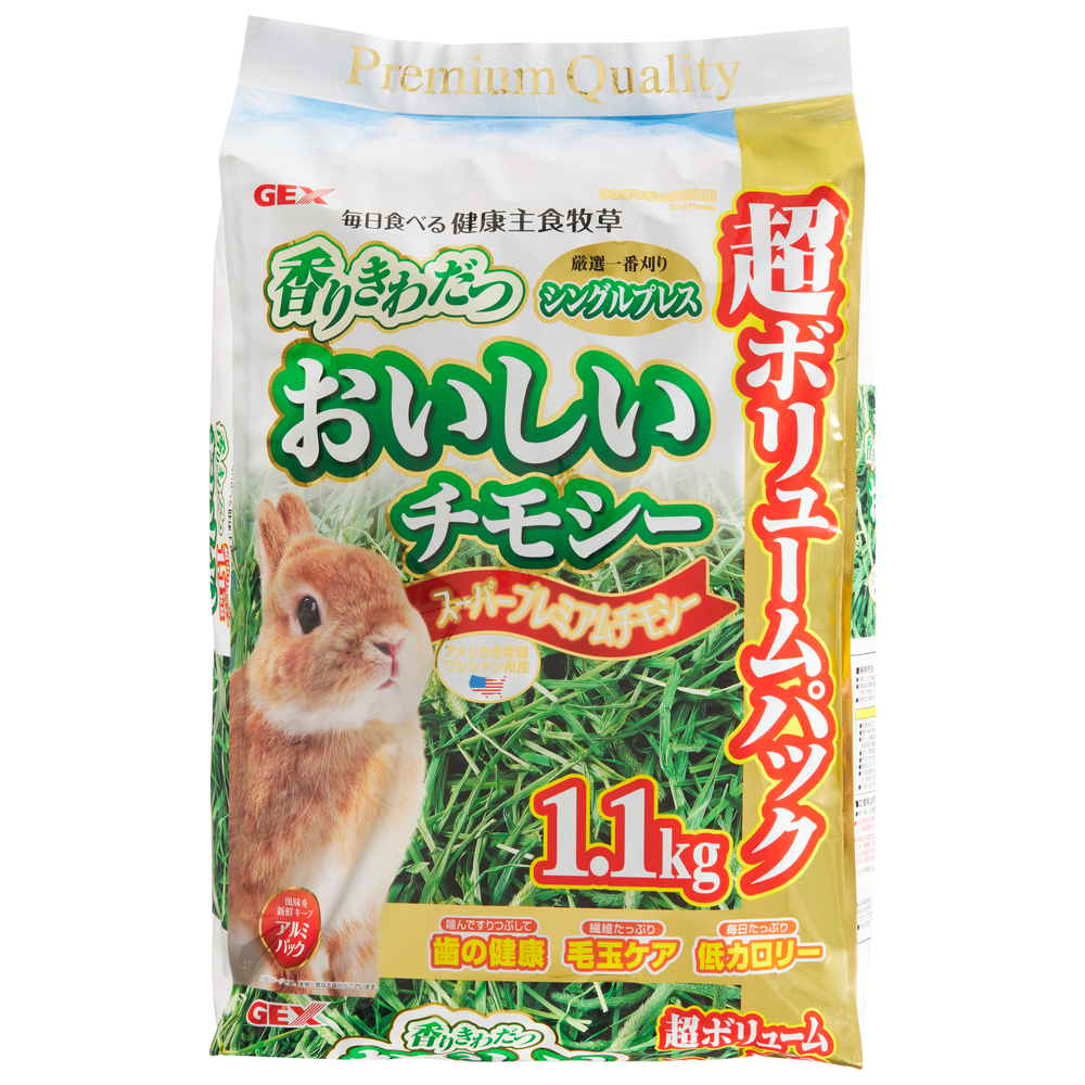 香りにこだわり、茶色い葉が少なく競走馬にも使用される最高級グレードの一番刈りチモシーを厳選して国内で袋詰めしています。高圧縮のダブルプレスよりも圧縮・カットしていないシングルプレスを採用。アメリカワシントン州の広大な気候で育てられた高級チモシーの中でも厳しい基準をもとに選別されたものだけを使用しています。丈の長い牧草をすり潰しながら噛むことで、歯の伸びすぎを抑え、歯の健康維持をサポートします。チモシーに豊富に含まれる繊維質は、飲み込んだ毛を絡めながら排出し、お腹の健康維持をサポートします。主食として毎日食べる牧草は、高繊維でカロリーが低いチモシーが最適です。