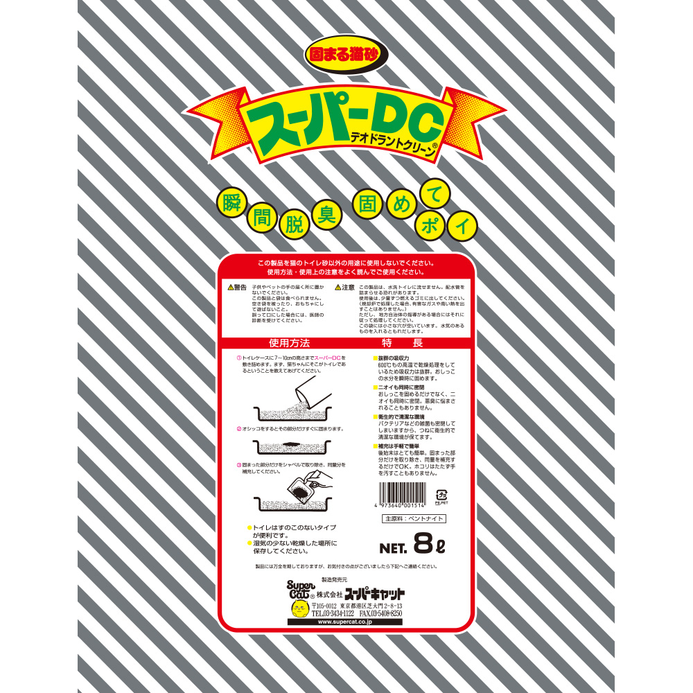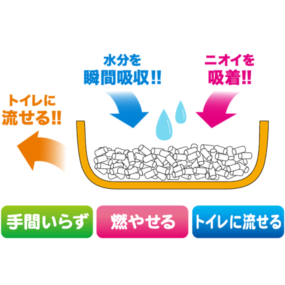 600℃もの高温で乾燥処理をしているため吸収力は抜群。おしっこの水分を瞬時に固めます。おしっこを固めるだけではなく、ニオイも同時に密閉。悪臭に悩まされることもありません。バクテリアからなどの雑菌も密閉してしまいますから、つねに衛生的で清潔な環境が保てます。後始末はとても簡単。固まった部分だけを取り除き、同量を補充するだけです。ホコリがたたず、手を汚すこともありません。