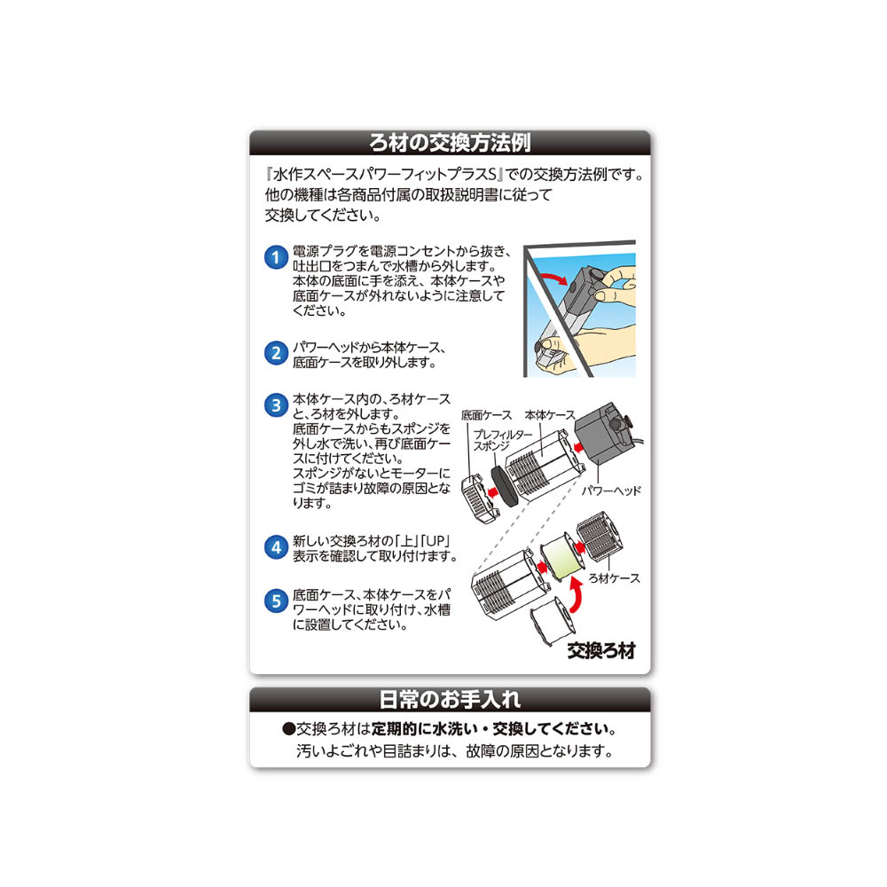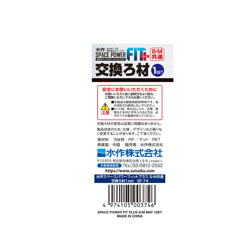 特殊素材の三層構造マット(ハーフサイズ2個)、水作スペースパワーフィットシリーズS/M共通、1セット入り。使用中に破損・変形・劣化が見られた場合は、直ちに使用を中止してください。本製品は観賞魚及び水棲生物飼育専用につき、他の目的で使用しない事。セット時や魚の出し入れ、点検掃除等水中に手を入れる時は全ての電源を切る事。