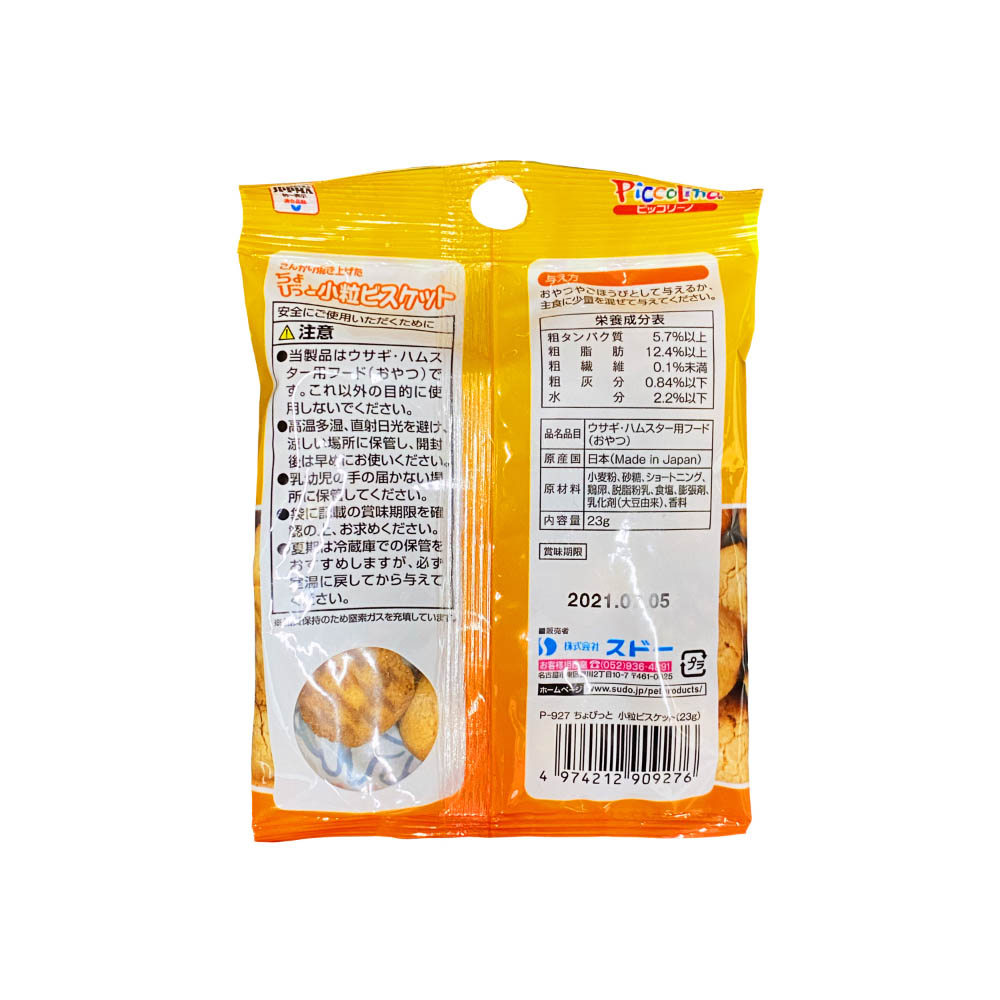新鮮なタマゴと小麦粉、乳製品の香ばしさ!こんがりと焼き上げた栄養豊かなビスケットです。対象動物の種類・年齢・体重・健康状態に合わせ、給与量の目安を参考に調整してください。当製品は小動物用フード(おやつ)ですこれ以外の目的に使用しないでください。高温多湿、直射日光を避け、涼しい場所に保管し、開封後は早めにお使いください。乳幼児の手の届かない場所に保管してください。袋に記載の賞味期限を確認の上、お求めください。夏季は冷蔵庫での保管をおすすめしますが、必ず室温に戻してから与えてください。