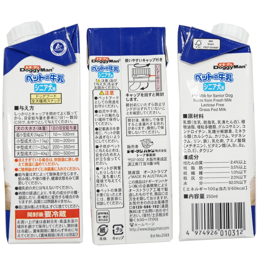 オーストラリア産の生乳から作った、生乳そのままの風味が生きているシニア犬用の牛乳です。おなかにやさしい乳糖ゼロ。製造過程で乳糖を完全分解しました。人口着色料や香料、防腐剤を使用せず、生乳の旨さを最大限引き出しています。グルコサミン、コンドロイチン、ビタミン、ミネラル、カルシウム、タウリン配合。シニア犬の健全な生活をサポートします。シニア犬にうれしい低カロリー。グルコサミン、コンドロイチンを配合した関節にもやさしいおいしい牛乳です。
