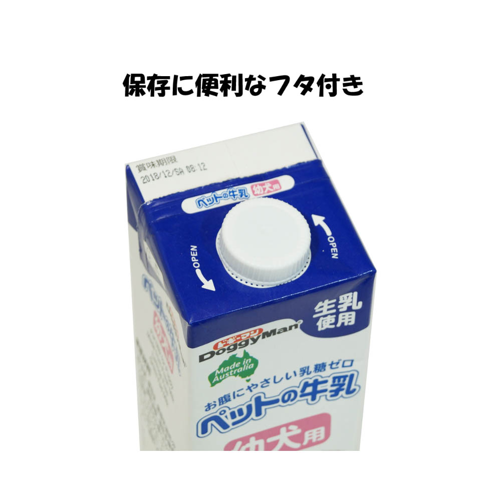 オーストラリア産の生乳から作った、生乳そのままの風味が生きている幼犬用の牛乳です。おなかにやさしい乳糖ゼロ。製造過程で乳糖を完全分解しました。人口着色料や香料、防腐剤を使用せず、生乳の旨さを最大限引き出しています。ビタミン、ミネラル、カルシウム、タウリン配合。幼犬の健全な生活をサポートします。成長が著しい幼犬向けに成分調整した毎日おいしく与えられる牛乳です。安心して給与や保存をしていただくために、パッケージの記載事項を必ずお守りください。注意ぺットフードとしての用途をお守りください。幼児や子供、ペットの触れない場所で保存してください。記載表示を参考に、ペットが飲み過ぎないようにしてください。子供がペットに与えるときは、安全のため、大人が立ち会ってください。ペットが興奮したりしないよう、落ち着いた環境で与えてください。ペットの体調が悪くなったときには、獣医師に相談してくださいお買い上げ後は直射日光・高温多湿の場所を避けて保存してください。開封後は冷蔵し、賞味期限に関わらず早めに与えてください。