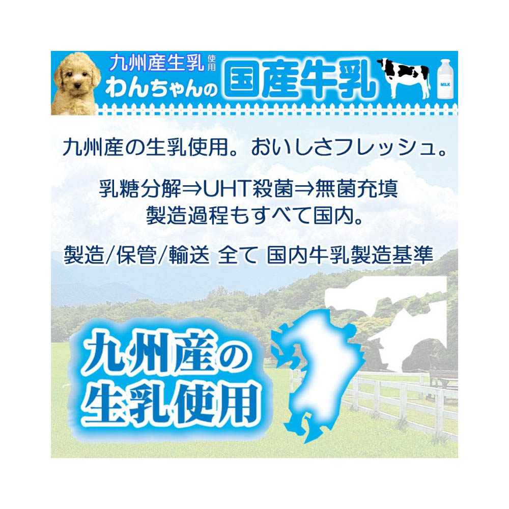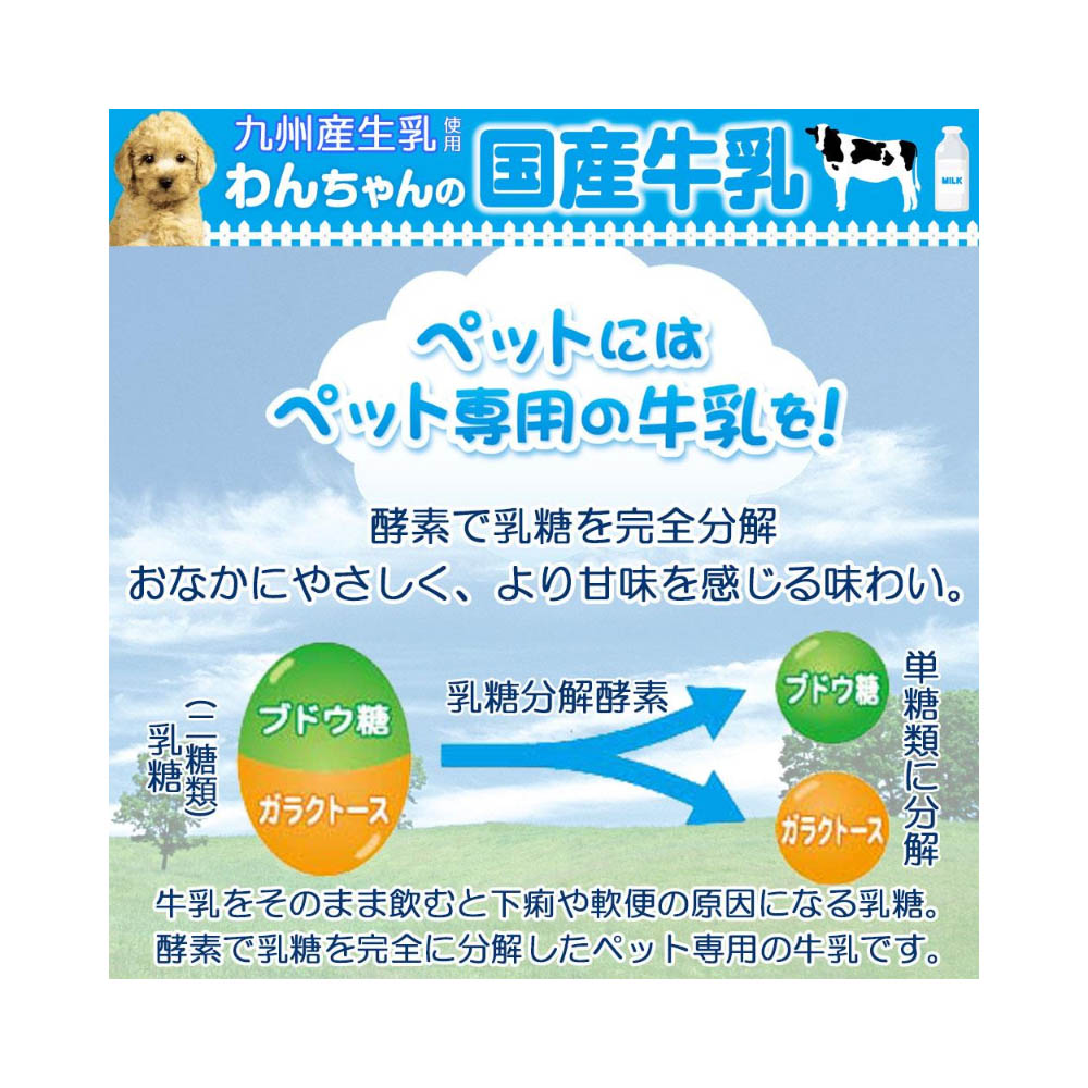 九州育ちの生乳から作った、生乳そのままの風味が生きている愛犬用の牛乳。おなかにやさしい乳糖ゼロ。製造過程で乳糖を完全分解。九州産生乳をそのまま国内工場で製造。安心できるおいしさ。着色料や香料は使用せず、生乳の旨さを最大限引き出している。毎日飲める美味しい牛乳。タウリン配合。たっぷり1L。注意ぺットフードとしての用途をお守りください。幼児や子供、ペットの触れない場所で保存してください。記載表示を参考に、ペットが飲み過ぎないようにしてください。子供がペットに与えるときは、安全のため、大人が立ち会ってください。ペットが興奮したりしないよう、落ち着いた環境で与えてください。ペットの体調が悪くなったときには、獣医師に相談してください開封時は清潔なはさみをご使用ください。お買い上げ後は直射日光・高温多湿の場所を避けて保存してください。開封後は冷蔵し、賞味期限に関わらず早めに与えてください。