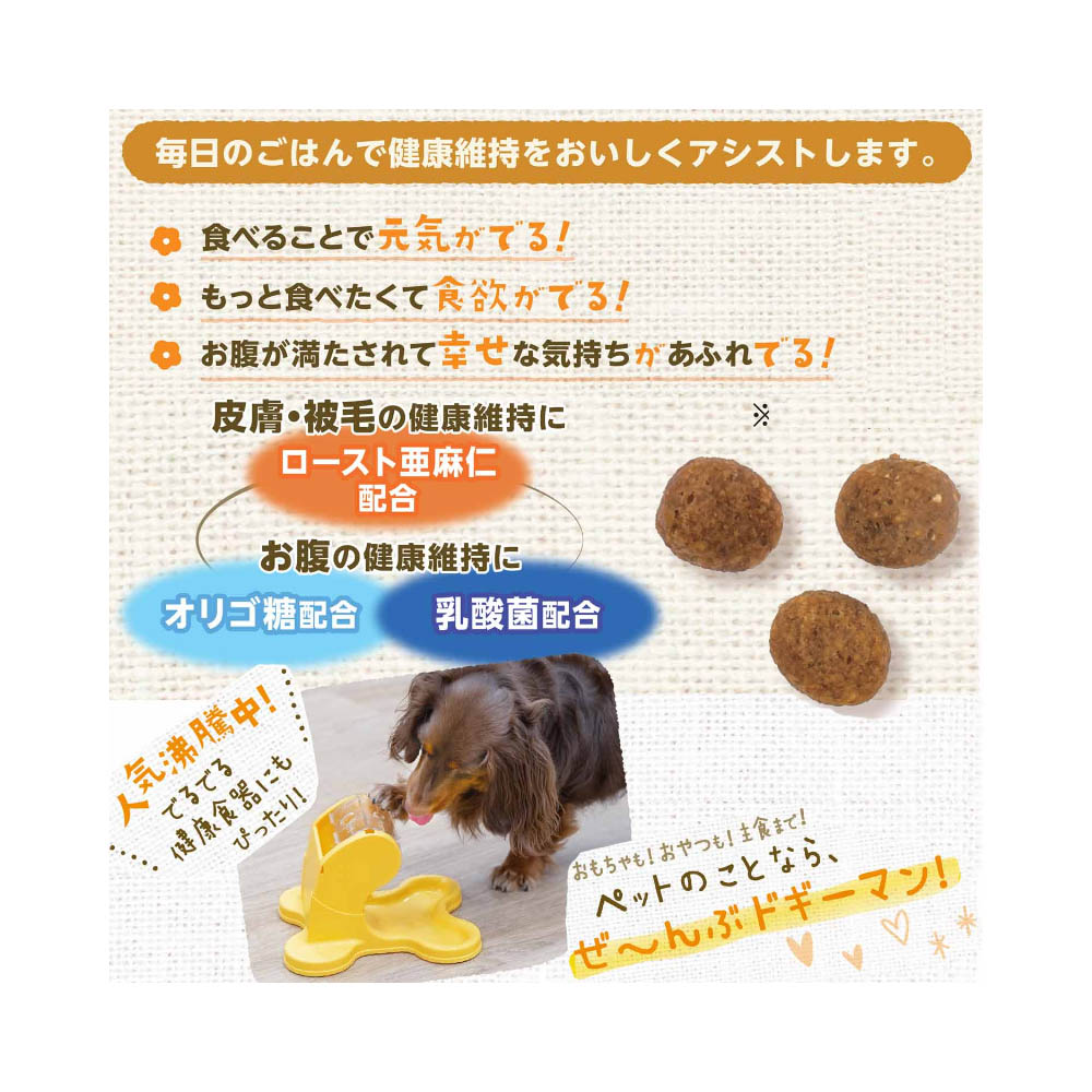 毎日のごはんで健康維持をおいしくアシストするドライフードがついに登場!保存料・香料・着色料不使用。ペットフードとしての用途をお守りください。幼児や子供、ペットの触れない場所で保存してください。記載表示を参考に、ペットが食べ過ぎないようにしてください。必ず様子を見ながら与えてください。子供がペットに与えるときは、安全のため大人が立ち会ってください。ペットが興奮したりしないよう、落ち着いた環境で与えてください。ペットの体調が悪くなったときには、獣医師に相談してください。お買い上げ後は直射日光、高温多湿の場所を避けて保存してください。開封後は虫などが入らないように密封して保存し、賞味期限に関わらず早めに与えてください。