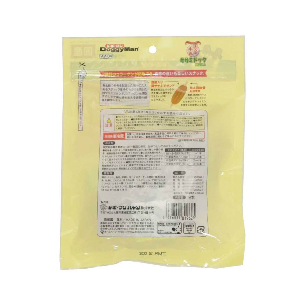 魚と鶏のコラーゲンスティックにササミを巻いたおやつ。ほうれん草とにんじんの粒入り。歯ごたえもよい。ペットフードとしての用途をお守りください。記載表示を参考に与えすぎないようご注意ください。生後2ヶ月未満の幼犬には与えないでください。商品パッケージの「注意」及び「与え方」を必ずお読みください。幼児や子供、ペットの触れない場所で保存してください。子供がペットに与えるときは、安全のため大人が立ち会ってください。ペットが興奮したりしないよう、落ち着いた環境で与えてください。ペットの体調が悪くなったときは、獣医師に相談してください。お買い上げ後は直射日光・高温多湿の場所を避けて、保存してください。開封後は必ず口を閉めて冷蔵し、賞味期限に関わらず早めに与えてください。