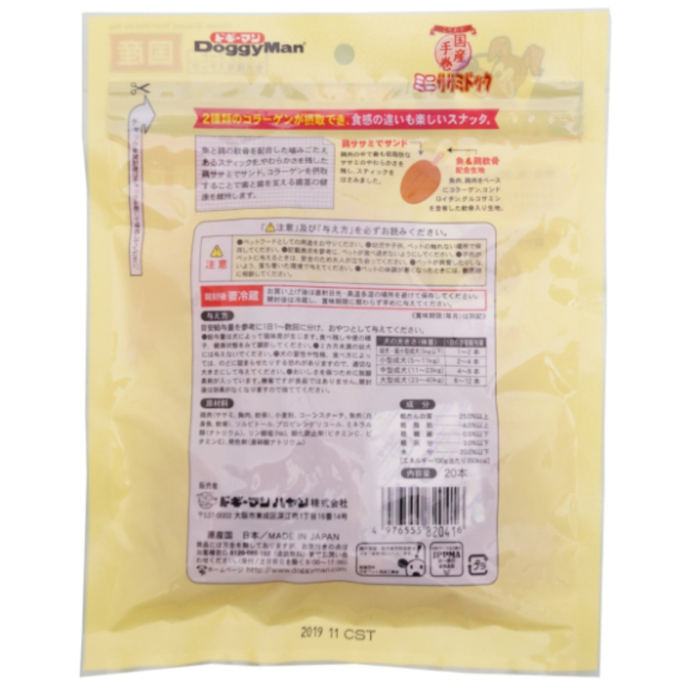 魚と鶏、2種類のコラーゲンを摂取できる国産巻き物スナック。小さなおくちに食べやすいミニサイズ。