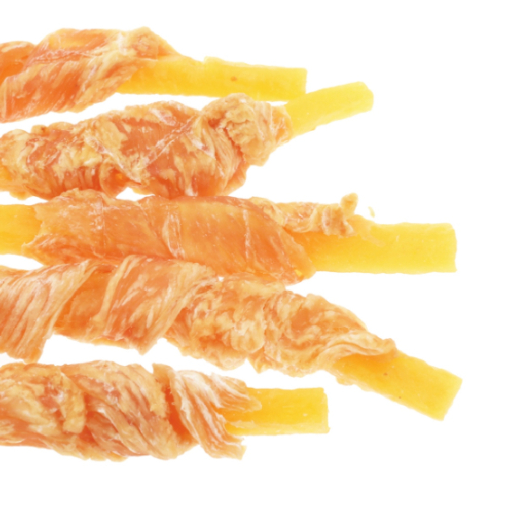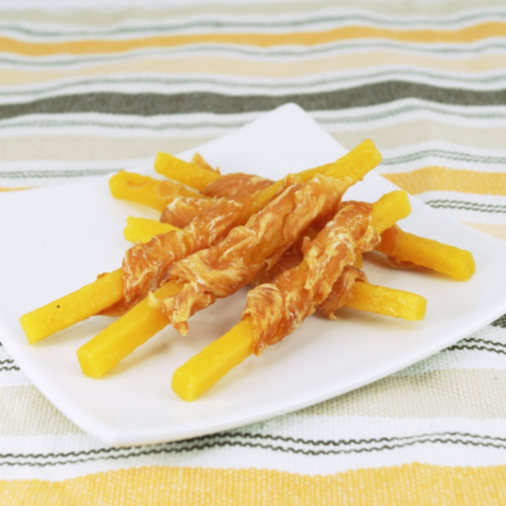 おなかの健康維持に役立つ食物繊維が豊富なさつまいもに鶏ササミを巻きつけた、ヘルシーなスナックです。