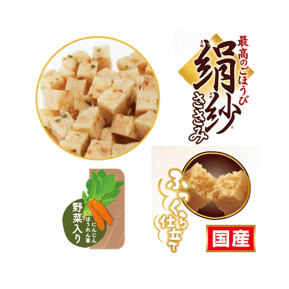 ササミたっぷり、至福の味わい。ふんわりやわらか新食感のごほうびおやつ。にんじん・ほうれん草入り。ペットフードとしての用途をお守りください。幼児や子供、ペットの触れない場所で保存してください。記載表示を参考に、ペットが食べ過ぎないようにしてください。子供がペットに与えるときは、安全のため大人が立ち会ってください。ペットが興奮したりしないよう、落ち着いた環境で与えてください。ペットの体調が悪くなったときには、獣医師に相談してください。・お買い上げ後は直射日光・高温多湿の場所を避けて保存してください。開封後は冷蔵し、賞味期限に関わらず早めに与えてください。