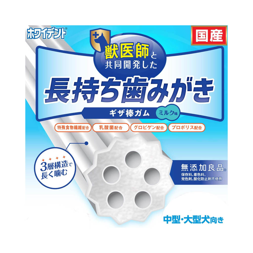 犬ちゃんの歯の構造、噛み方を熟知した獣医師と共同開発したオリジナル3層構造の長く噛み続けて食べる長持ち歯みがきガム。コラーゲンを含む牛皮を主原料にハードに仕上げたガムスナック。ほんのり甘いミルクの香りと味が食欲をそそる。保存料・着色料・発色剤・酸化防止剤不使用。表面のギザギザ層が歯をカチッと固定し、ブラシホール層に歯が入り込み歯垢を除去、しっかり長く噛ませるチューイング層のオリジナル3層構造。3つのブラッシング層を長く噛むことで歯垢を拭き取り口臭を防ぐ。歯垢を絡めとる特殊食物繊維、歯周の健康を維持するグロビゲン、乳酸菌、プロポリスを配合。中型・大型犬向けサイズ。ペットフードとしての用途をお守りください。幼児や子供、ペットの触れない場所で保存してください。記載表示を参考に、ペットが食べ過ぎないようにしてください。必ず様子を見ながら与えてください。子供がペットに与えるときは、安全のため大人が立ち会ってください。ペットが興奮したりしないよう、落ち着いた環境で与えてください。ペットの体調が悪くなったときには、獣医師に相談してください。【開封後要冷蔵】お買い上げ後は直射日光・高温多湿の場所を避けて保存してください。開封後は密封の上冷蔵し、賞味期限に関わらず早めに与えてください。