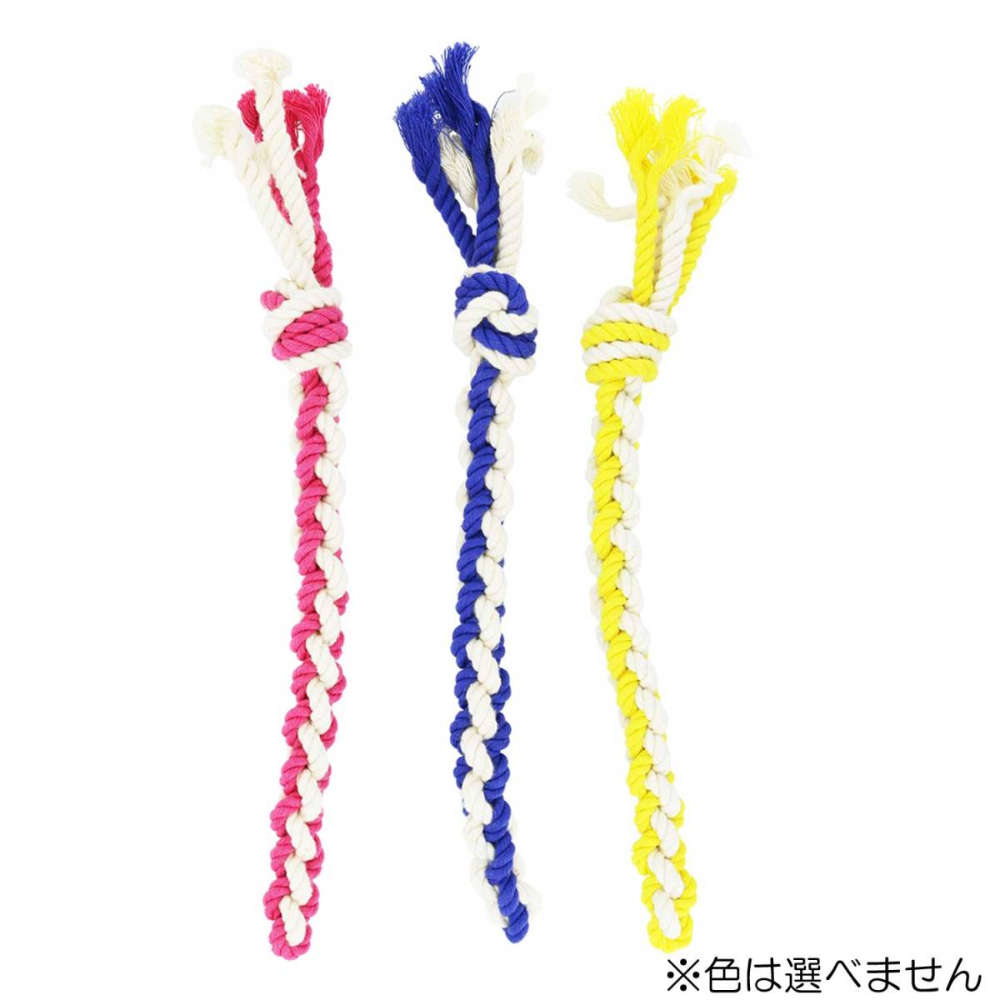 コットンを編んで作った玩具。噛む事で歯が編み部分に入りデンタル効果も。3色のアソートタイプ。超小型・小型犬対象。