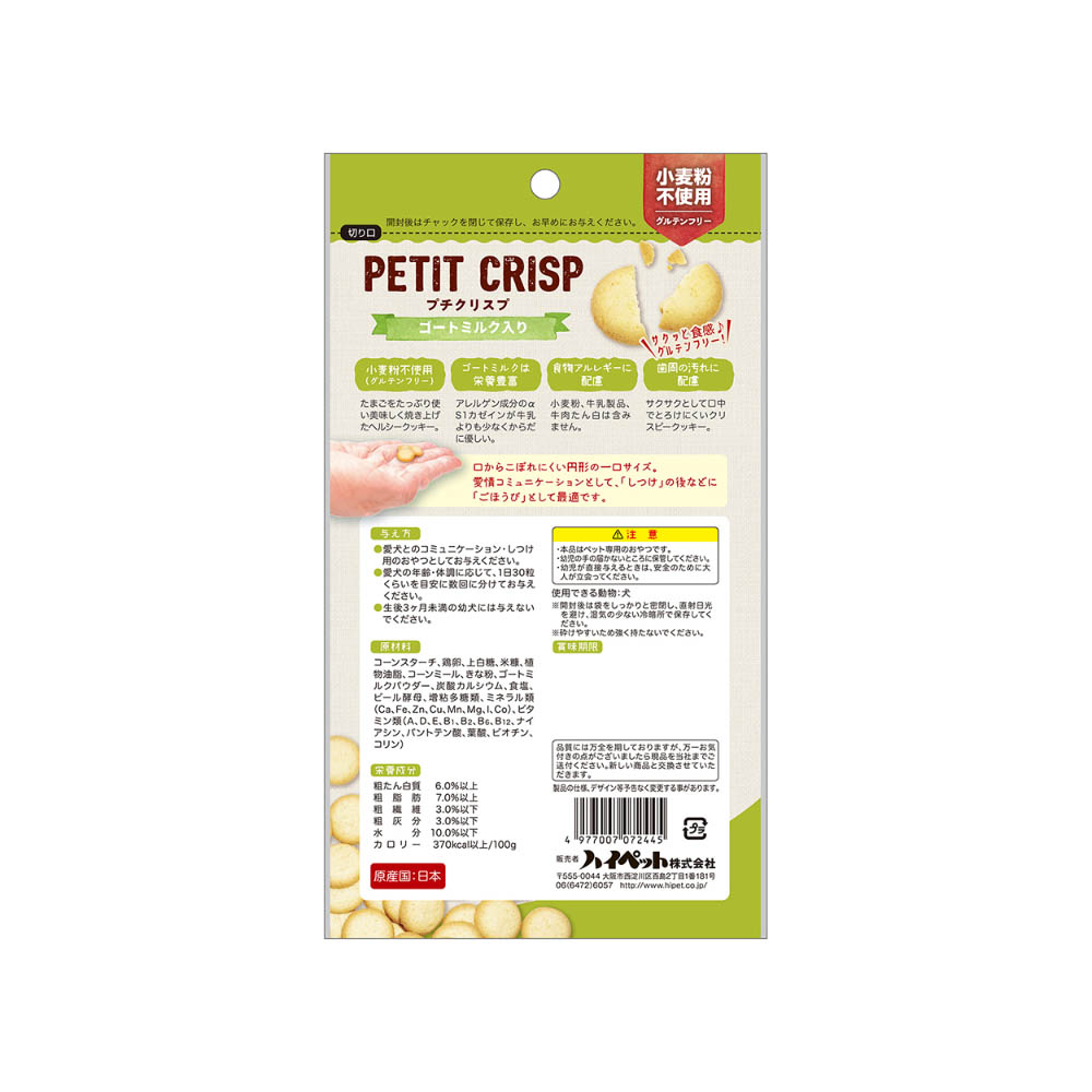 小麦粉不使用のクリスピークッキー。からだに優しく栄養豊富なゴートミルク配合。牛乳製品・牛肉たん白不使用。生後3ケ月未満の幼犬には与えないでください。開封後は、袋をしっかり密閉し、直射日光を避け、湿気の少ないところで保管してください。