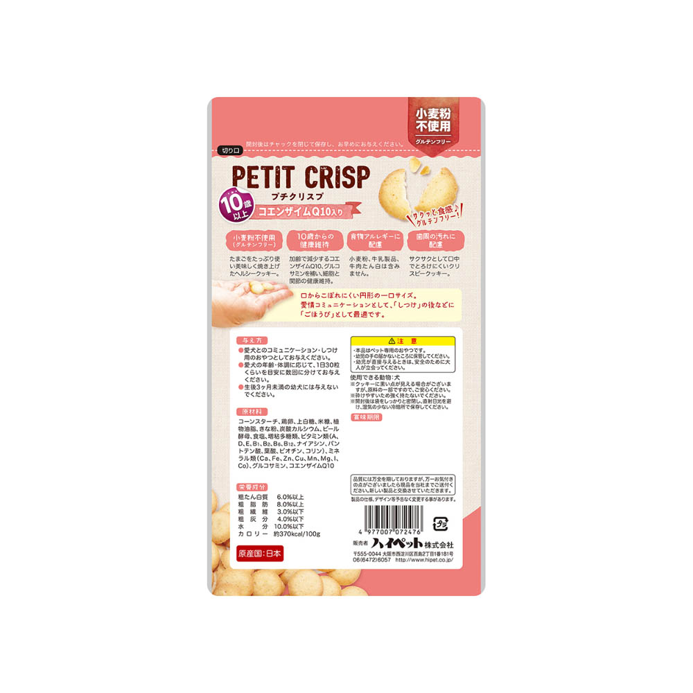 小麦粉不使用のクリスピークッキー。加齢で減少するコエンザイムQ10、グルコサミンを補い細胞と関節の健康維持。生後3ケ月未満の幼犬には与えないでください。開封後は、袋をしっかり密閉し、直射日光を避け、湿気の少ないところで保管してください。
