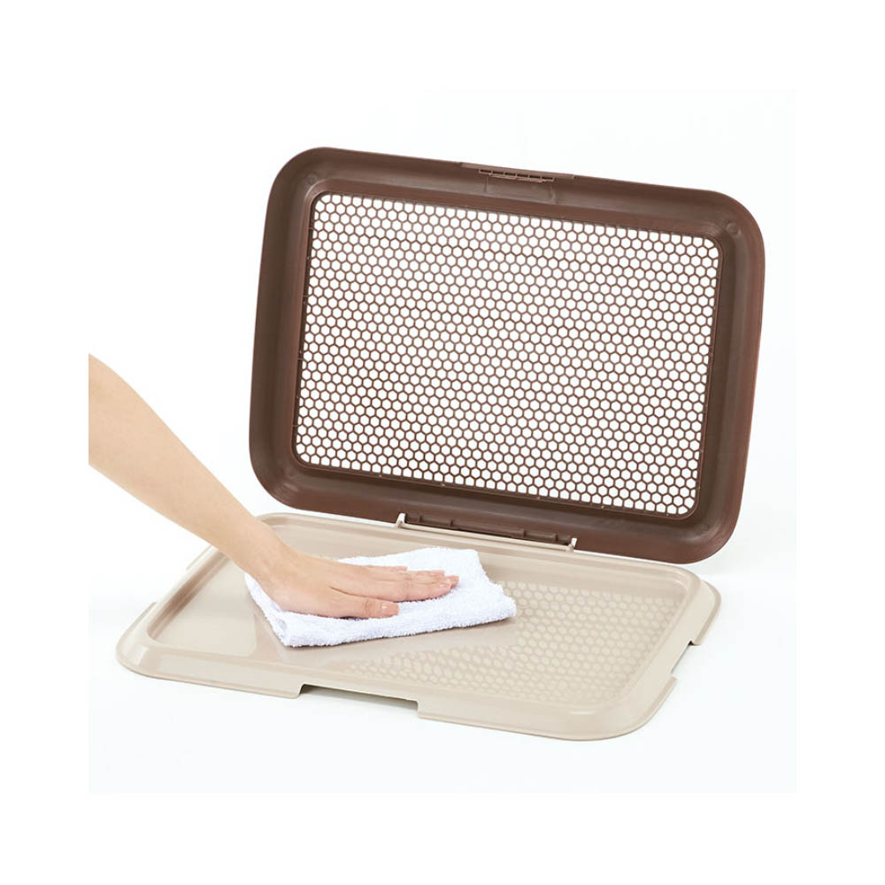 シーツへのいたずらを防止&幼犬から老犬まで使える低床式の犬用トイレ。メッシュは汚れが溜まりにくいハニカム形状。シーツ交換時も片側のロックを解除するだけで簡単です。抗菌成分を配合&出っ張りの無い洗いやすい形状で、いつでも清潔にご使用いただけます。滑り止めが付いているので、フローリング等の上に置いても滑らず安心です。レギュラーサイズのシーツに対応使用中に破損・変形・劣化が見られた場合は、直ちに使用を中止してください。本製品は犬用の室内専用トイレです。他の用途には使用しないでください。安全にお使いいただくために、ご使用前に本体付属の取扱説明書を必ずお読みください。ペットが本体やメッシュを強く引っかいたり噛む場合は、ケガや誤飲を防ぐため使用をおやめください。
