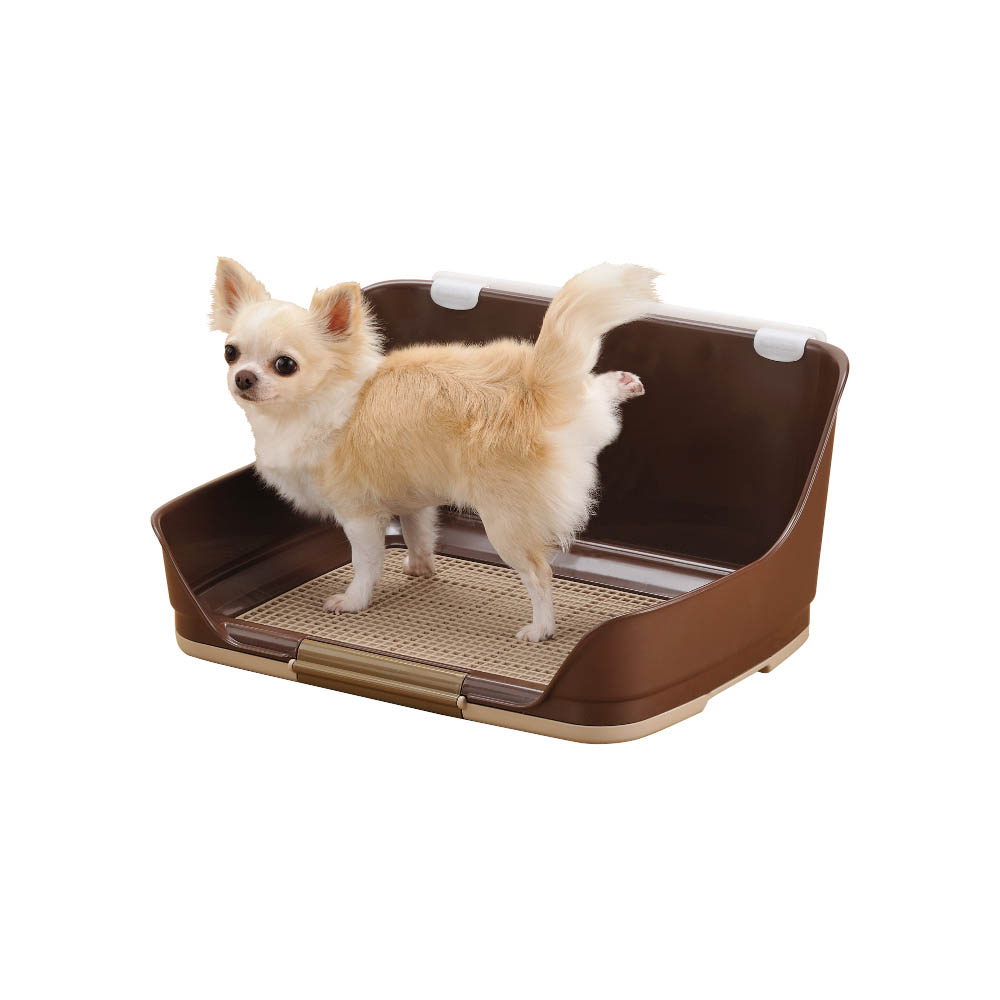 高い壁つきの犬用トイレ。足をあげておしっこをする子や、お尻がはみ出しがちな子におすすめです。背面の壁にペットシーツを固定できるので、おしっこの飛び散り防止にも効果的です。シーツへのいたずらを防ぐメッシュ付き。いたずらが無くなれば、メッシュを外してご使用いただけます。片側のロック解除でシーツの交換やトイレのお手入れも簡単。滑り止めが付いているので、フローリング等の上に置いても滑らず安心です。レギュラーサイズのシーツに対応使用中に破損・変形・劣化が見られた場合は、直ちに使用を中止してください。本製品は犬用の室内専用トイレです。他の用途には使用しないでください。安全にお使いいただくために、ご使用前に本体付属の取扱説明書を必ずお読みください。ペットが本体やメッシュを強く引っかいたり噛む場合は、ケガや誤飲を防ぐため使用をおやめください。