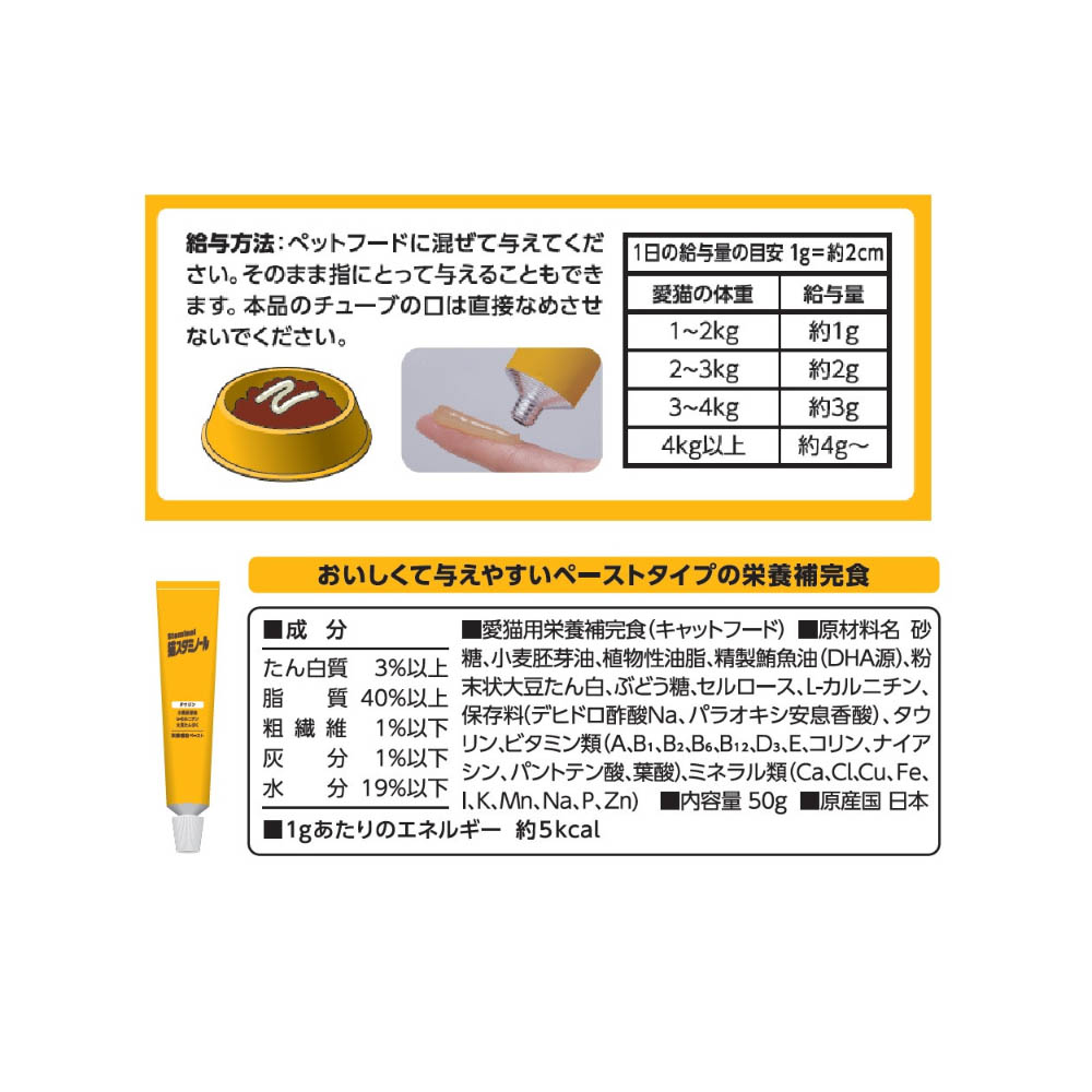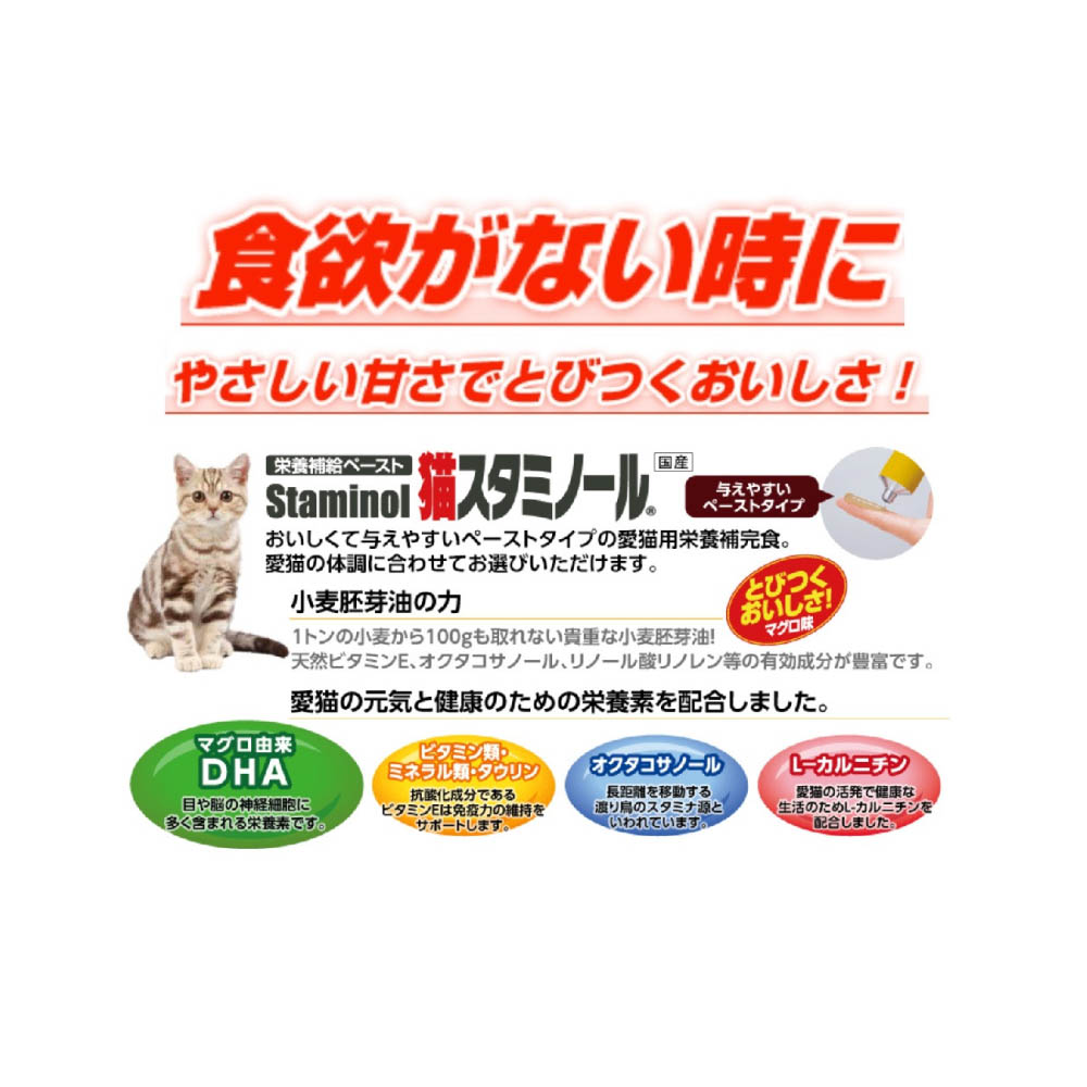 おいしくて与えやすいペーストタイプの栄養補完食。必須脂肪酸、ビタミンEなどの天然のビタミンを豊富に含む小麦胚芽油を配合。DHAが豊富に含まれる精製マグロ油を配合。ビタミンとミネラルをすぐれたバランスで配合。愛猫の必須栄養素であるタウリン配合。マグロ味で愛猫がよろこぶおいしさ。お買い上げ後は直射日光・高温多湿の場所は避け保管すること幼小児が誤飲しないように手が触れない場所に保管すること愛猫がチューブを飲み込む危険があるので保存場所に注意してください。直射日光・高温多湿の場所は避けて、保存してください。