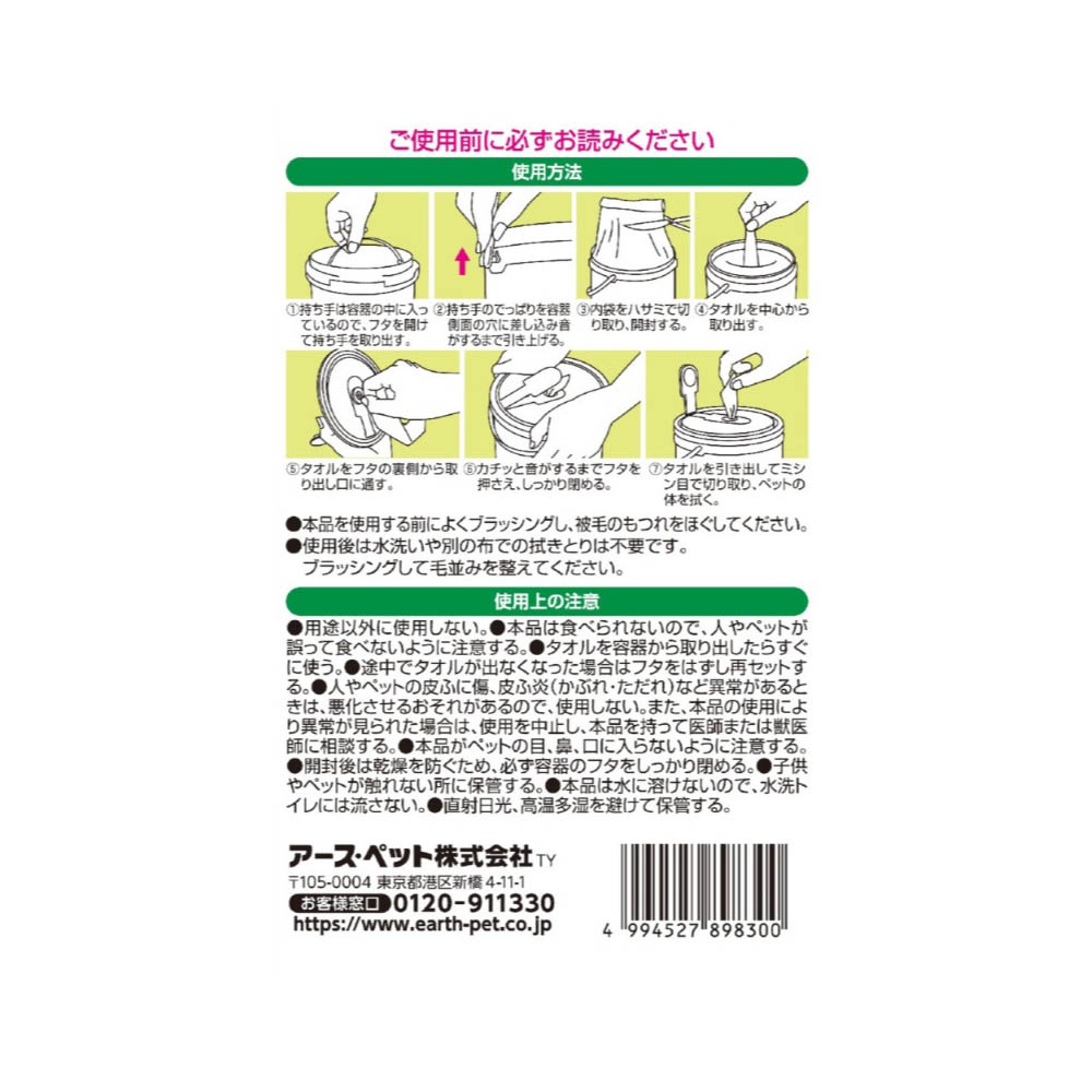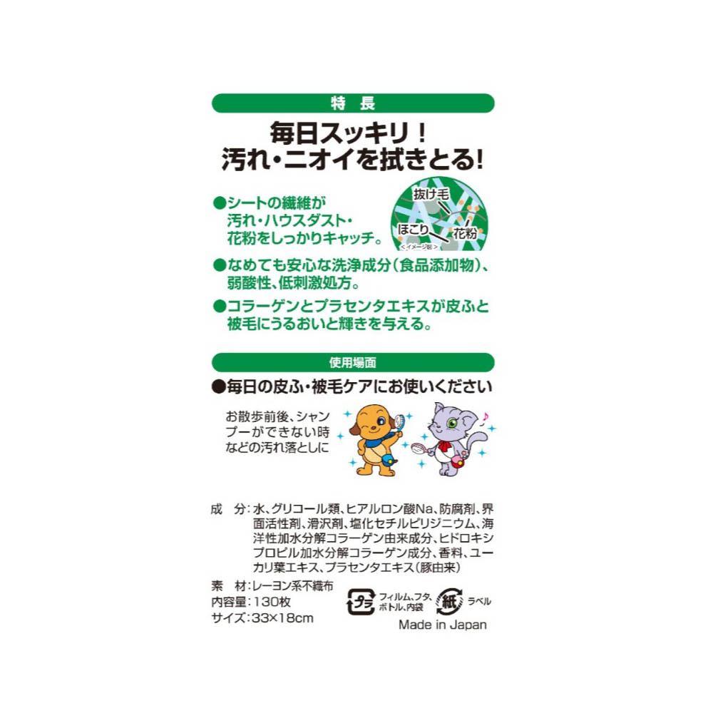 シートの繊維が汚れ・ハウスダスト・花粉をしっかりキャッチ。なめても安心な洗浄成分(食品添加物)、弱酸性、低刺激処方。コラーゲンとプラセンタエキスが皮ふと被毛にうるおいと輝きを与える。用途以外に使用しない本品は食べられないので人やペットが誤って食べないように注意するタオルを容器から取り出したらすぐに使う途中でタオルが出なくなった場合はフタを外し再セットする。人やペットの皮膚に傷、炎症(かぶれ)などの異常がある時は悪化させるおそれがあるので使用しないまた本品の使用により異常が見られた場合は、使用を中止し、本品を持って医師または獣医師に相談する本品が愛猫の目・口・耳に入らないように注意する開封後は乾燥を防ぐため、必ず容器のフタをしっかり閉める。本品は水には溶けないので水洗トイレには流さないでください。小児の手の届かない所に保管すること直射日光、高温及び多湿の場所を避けて保管する。