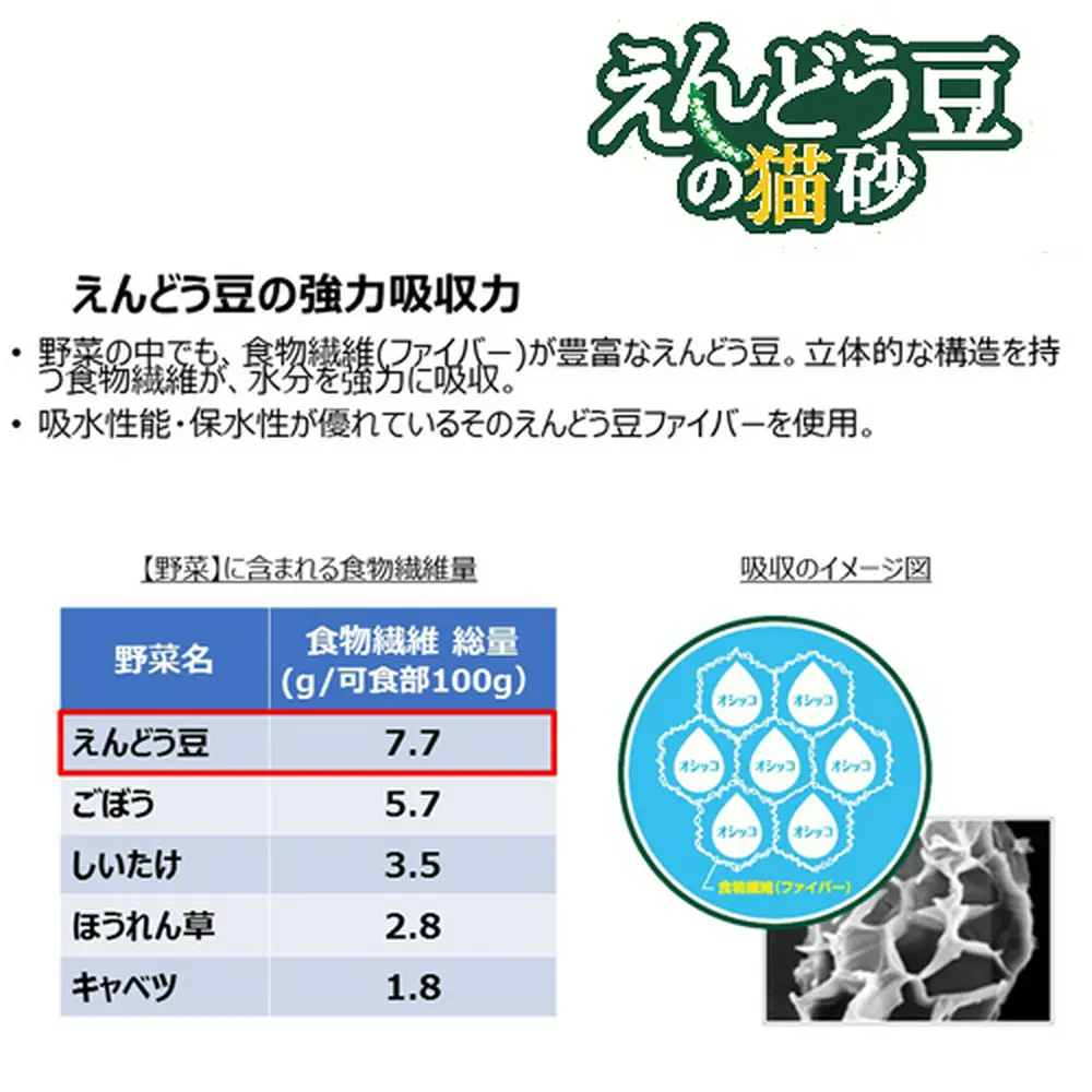 えんどう豆のチカラでオシッコを強力吸収。豆と竹・重曹のチカラが、強力消臭をサポート。えんどう豆だから、安心。固まりが小さく、経済的。