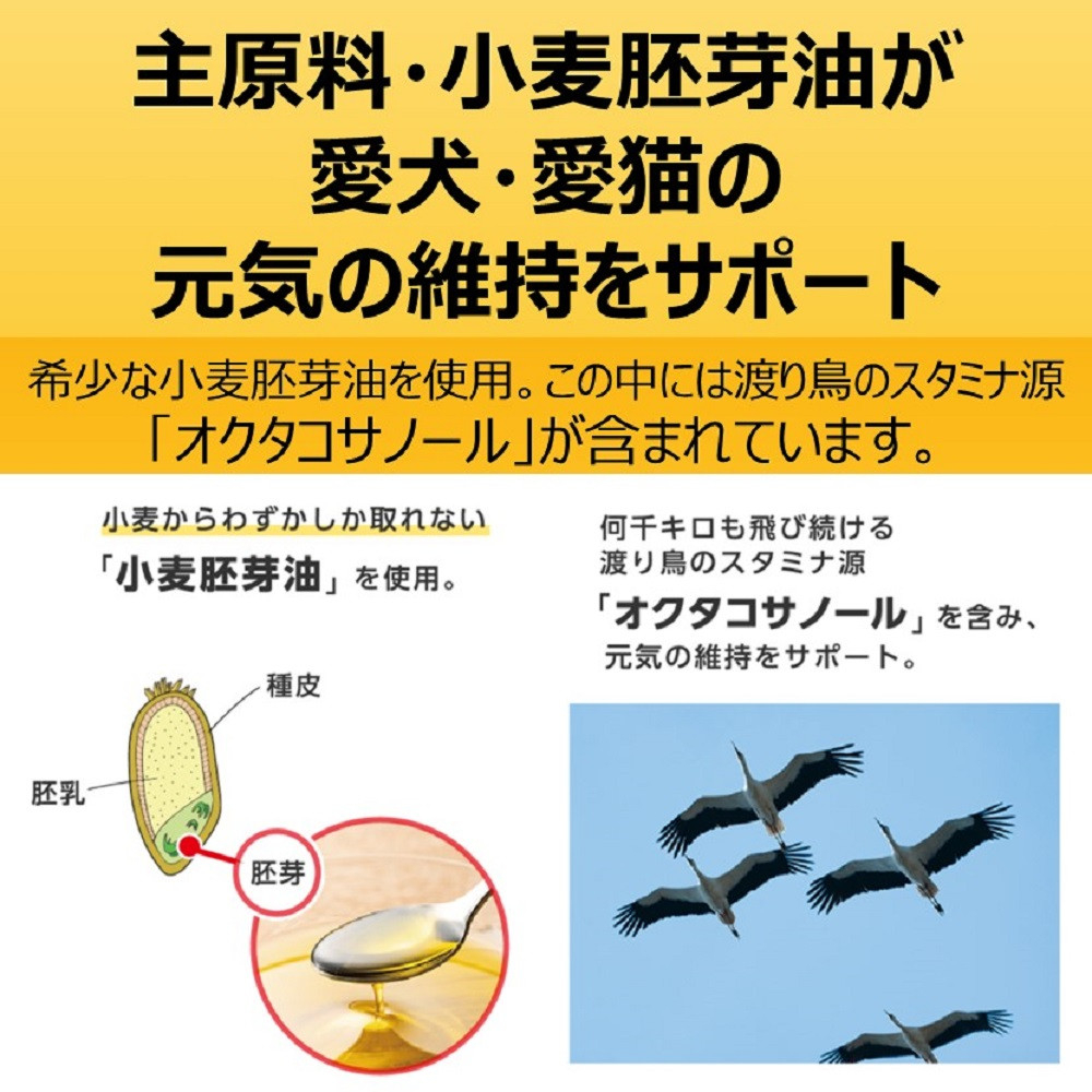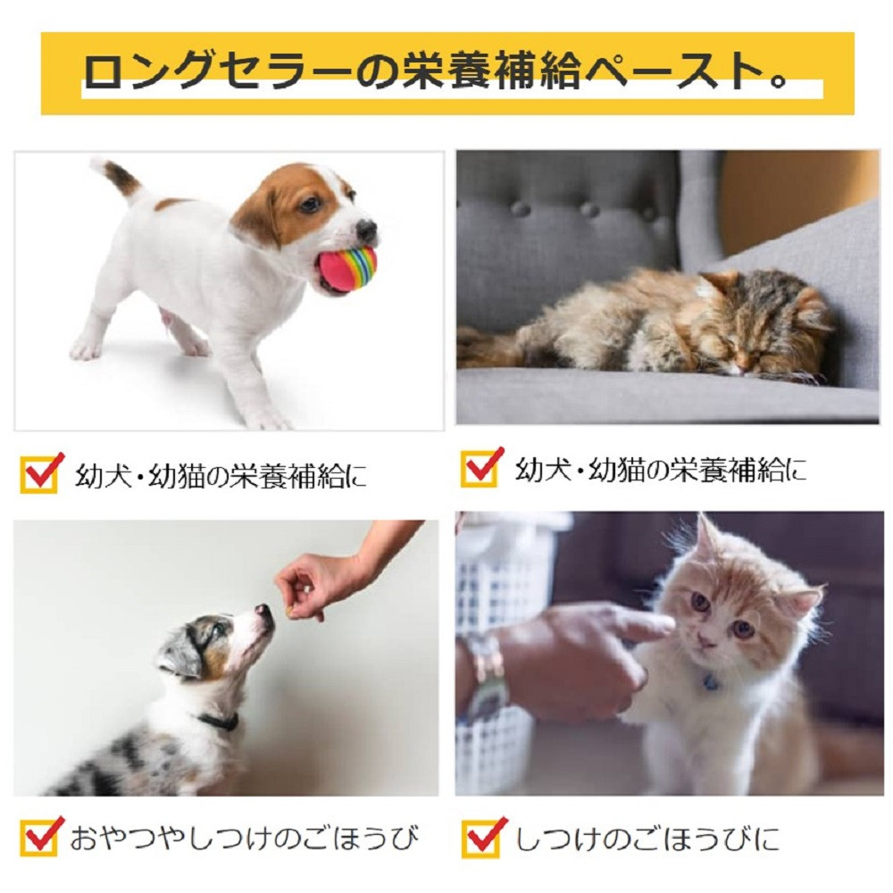 よろこぶやさしい甘さで、与えやすい栄養補給ペースト。すくすく健康な成長に必要なDHA、タウリンやビタミン・ミネラルを配合しサポート。必須脂肪酸やビタミンEなどの天然のビタミンにオクタコサノールを含む小麦胚芽油が主原料。子いぬ・子ねこの活発で健康な生活のためにL-カルニチンを配合。さらに良質のたんぱく質である大豆たん白も配合。
