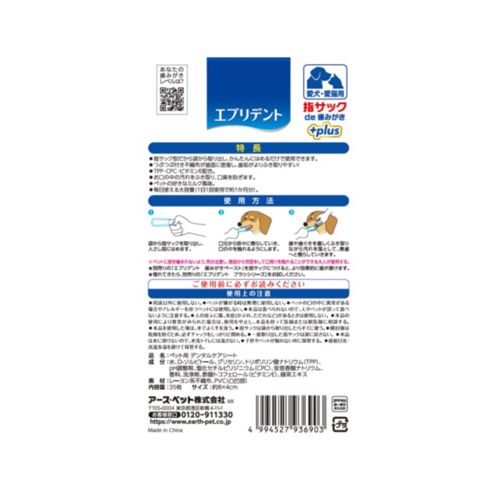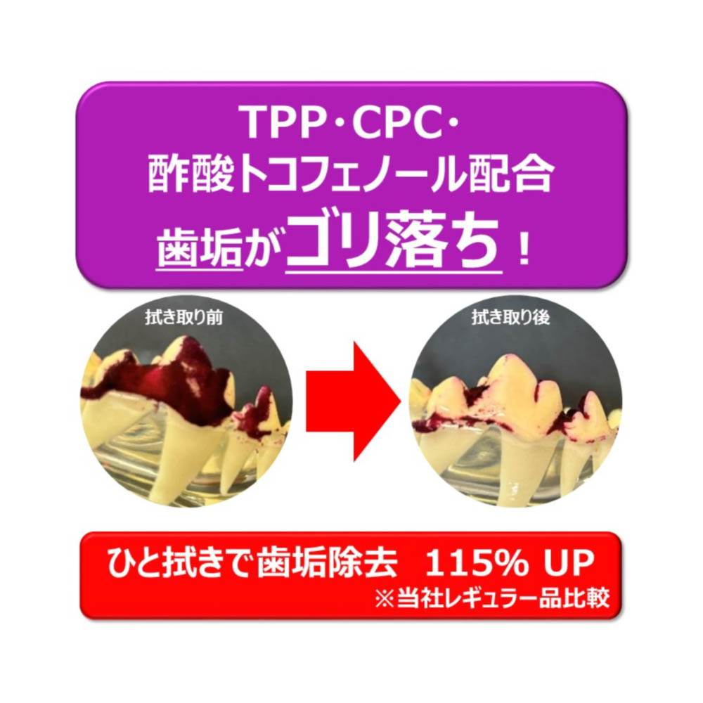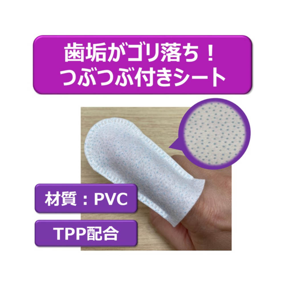 指サック型だから袋から取り出し、かんたんにはめるだけで使用できます。つぶつぶ付き不織布が歯面に密着し、歯垢がよりふき取りやすい。TPP・CPC・ビタミンE配合。お口の中の汚れをふき取り、口臭を防ぎます。ペットの好きなミルク風味。毎日使える大容量(1日1回使用で約1か月分)。用途以外に使用しない。ペットが嫌がる時は無理に使用しない。ペットの口の中に異常がある場合やアレルギーを持つペットには使用しない。本品は食べられないので、人やペットが誤って食べないように注意する。人の皮ふに傷、炎症(かぶれ、ただれなど)があるときは使用しない。本品の使用により異常がみられた場合は、使用を中止し、本品を持って医師または獣医師に相談する。本品を使用した後は、水でよく手を洗う。指サックは袋から取り出したらすぐに使う。開封後は乾燥を防ぐため、必ずチャックをしっかりと閉める。一度取り出した指サックは袋に戻さない。本品は水に溶けないので、水洗トイレには流さない。子供やペットが触れない所に保管する。直射日光・高温多湿を避けて保管する。