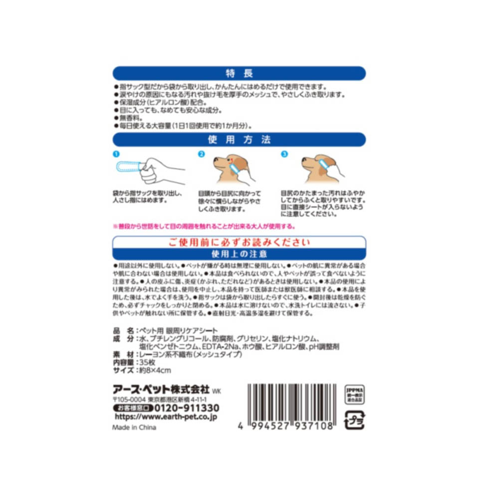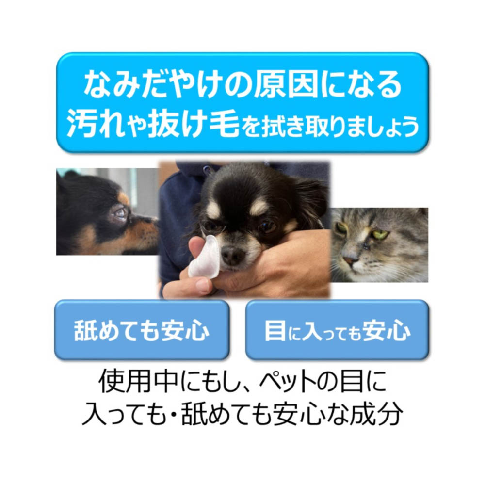 指サック型だから袋から取り出し、かんたんにはめるだけで使用できます。涙やけの原因にもなる汚れや抜け毛を厚手のメッシュで、やさしくふき取ります。保湿成分(ヒアルロン酸)配合。目に入っても、なめても安心な成分。無香料。毎日使える大容量(1日1回使用で約1か月分)。用途以外に使用しない。ペットが嫌がる時は無理に使用しない。ペットの肌に異常がある場合や肌に合わない場合は使用しない。本品は食べられないので、人やペットが誤って食べないように注意する。人の皮ふに傷、炎症(かぶれ、ただれなど)があるときは使用しない。本品の使用により異常がみられた場合は、使用を中止し、本品を持って医師または獣医師に相談する。本品を使用した後は、水でよく手を洗う。指サックは袋から取り出したらすぐに使う。開封後は乾燥を防ぐため、必ずチャックをしっかりと閉める。本品は水に溶けないので、水洗トイレには流さない。子供やペットが触れない所に保管する。・直射日光・高温多湿を避けて保管する。