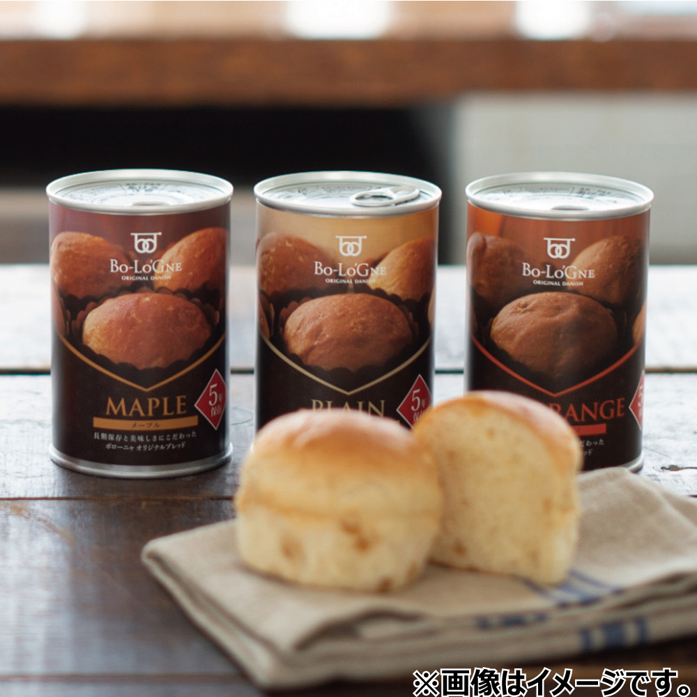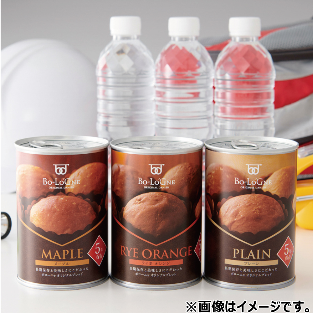 防災備蓄用の缶詰パンで、プレーン・メープル・ライ麦オレンジが各2缶入です。