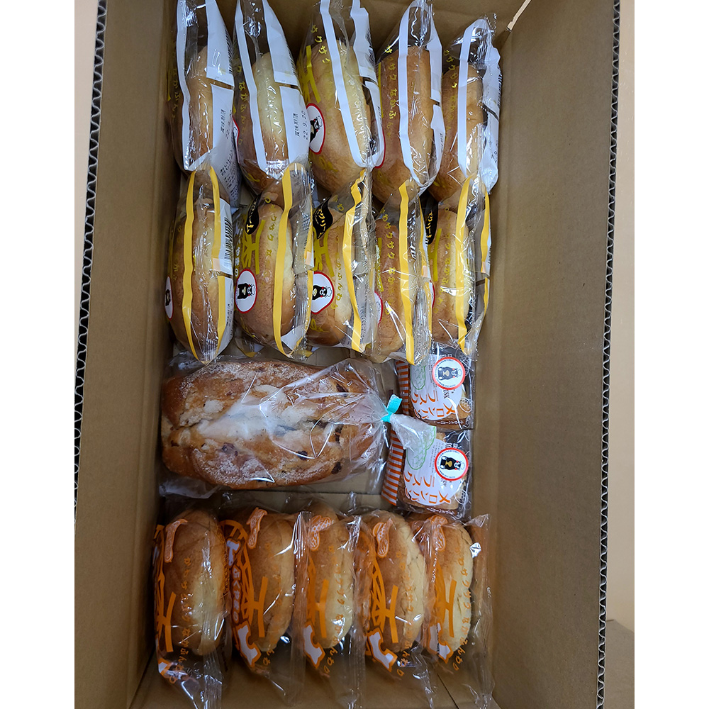 メロンパン×5、ピーナツメロンパン×5、チーズクリームメロンパン×5、ラスク×2、レーズンブレッド×1 全18個