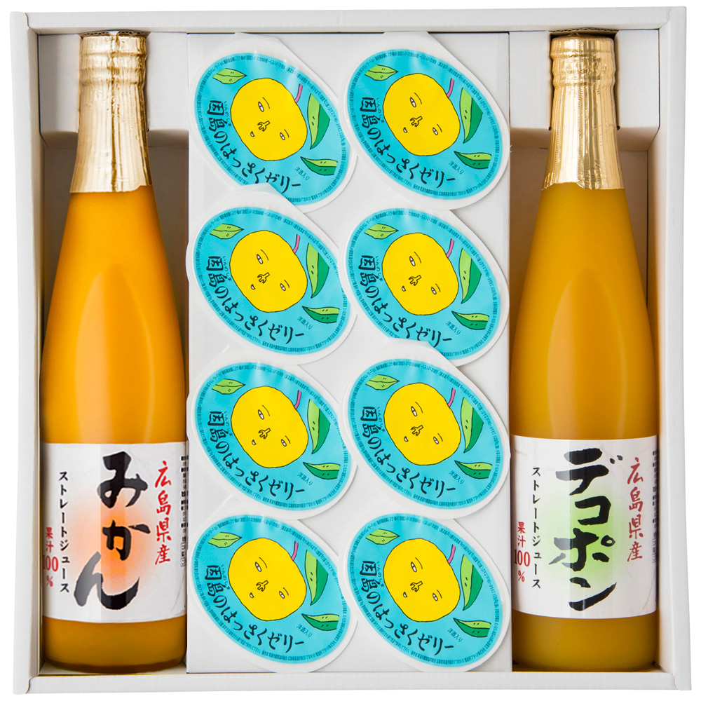 尾道市因島産の『八朔』をたっぷり使用し風味豊かでさっぱりとした味わいのゼリーと、広島県産果実100%ストレートジュースのセットです。