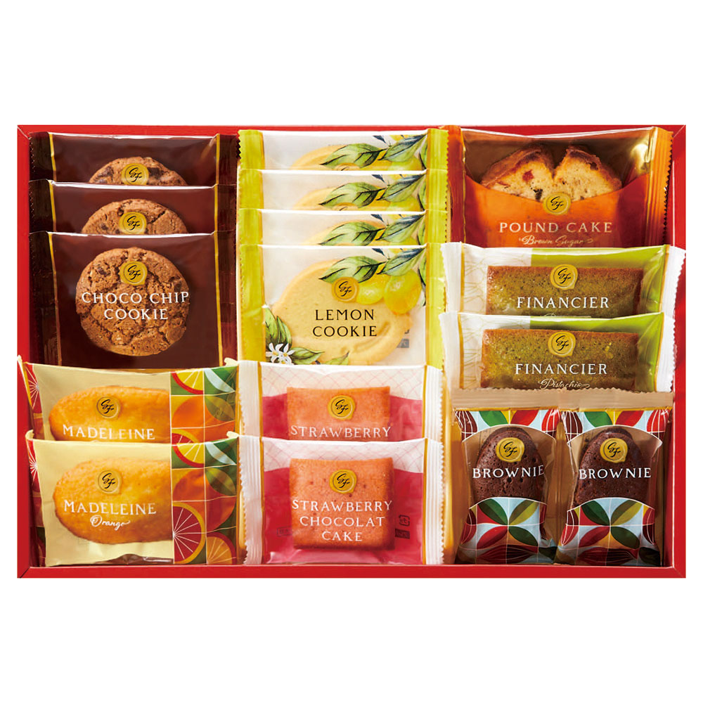 オレンジマドレーヌ・ストロベリーショコラケーキ・ピスタチオフィナンシェ・ブラウニー×各2個、ブラウンシュガーパウンドケーキ×1個、チョコチップクッキー×3個、レモンクッキー×4個、SFC-15