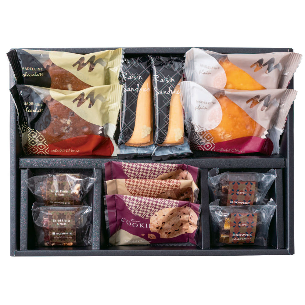 ブラウニー(ネーブル・ドライフルーツ&ナッツ)・レーズンサンド・マドレーヌ(プレーン・チョコ)・レーズンクッキー×各2個、チョコチップクッキー×1個、HOI-01A