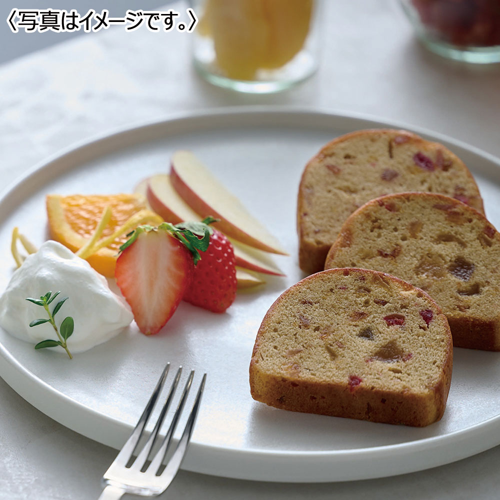 7種類のフルーツを洋酒に漬け込み、紅茶の生地でくるんだ、フルーツが詰まったパウンドケーキ。