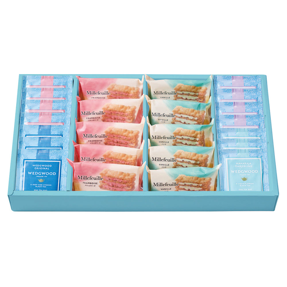 ミルフイユ(バニラ・フランボワーズ×各5個)、紅茶(イングリッシュブレックファスト・アールグレイ×各4袋、オリジナル・マハラジャダージリン×各3袋)、WWJ-05A