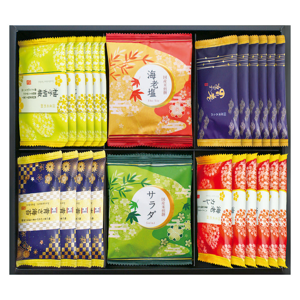 のり巻あられ・柚子胡椒煎餅・海老カレー煎餅×各6枚、青さ海苔煎餅×4枚、海老塩煎餅・サラダ煎餅×各3枚、RGN-30R