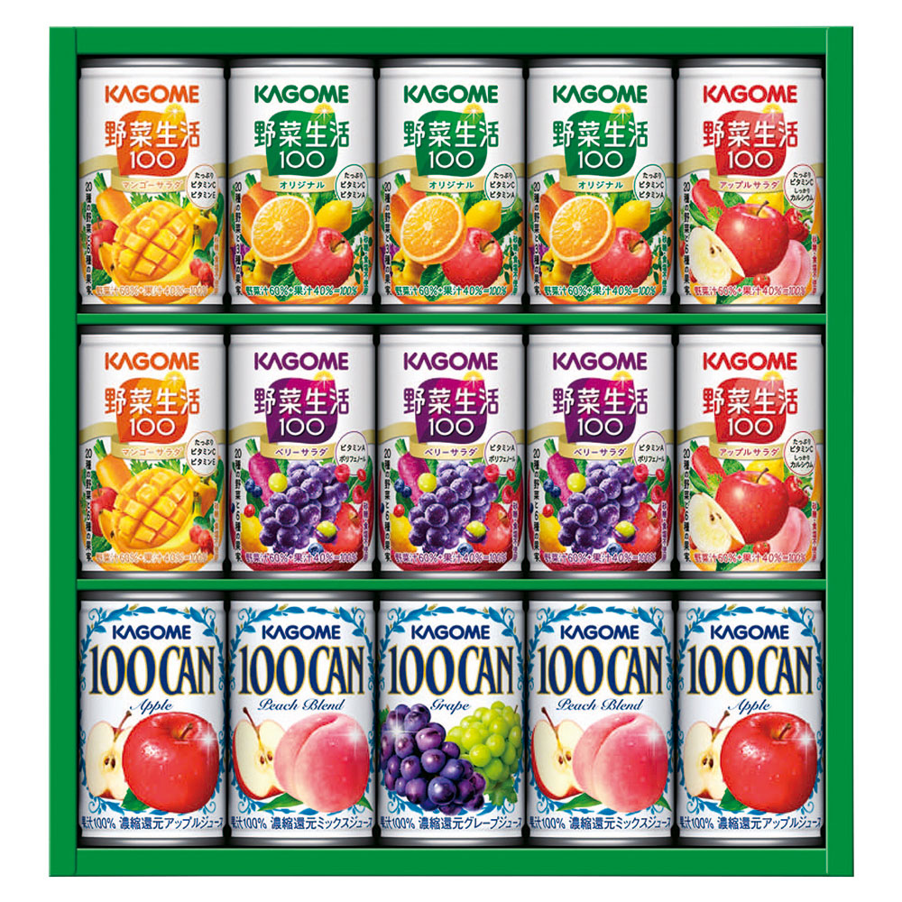 100CAN (アップル・ピーチブレンド各160g×2、グレープ160g×1)、野菜生活100(オリジナル・ベリーサラダ各160g×3、マンゴーサラダ・アップルサラダ各160g×2)、KSR-20P