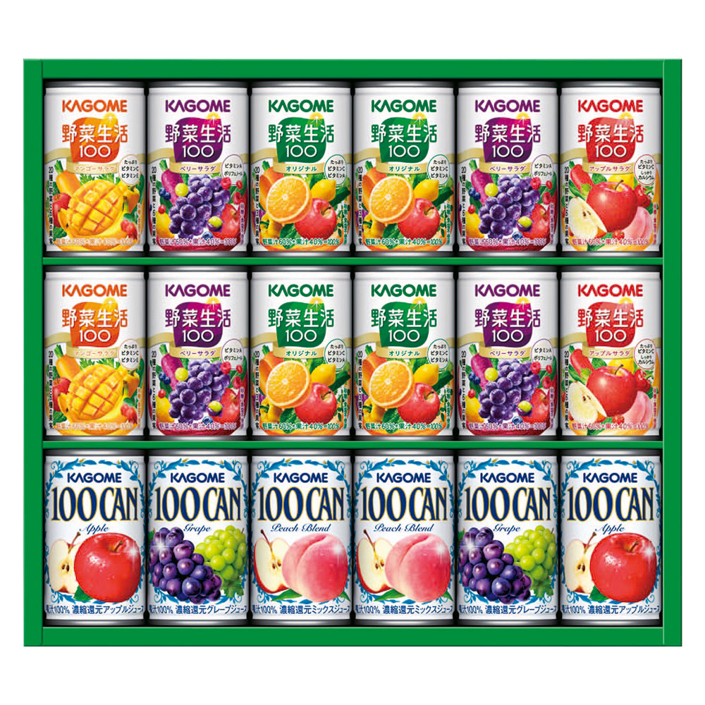 100CAN(アップル・ピーチブレンド・グレープ各160g×2)、野菜生活100(オリジナル・ベリーサラダ各160g×4、マンゴーサラダ・アップルサラダ各160g×2)、KSR-25P