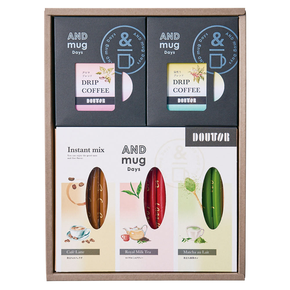 ドリップパック(アロマブレンド4P・深煎りブレンド4P×各1個)、インスタントスティック(泡立ちカフェラテ・ロイヤルミルクティー・泡立ち抹茶オレ×各4本)、DTC-05A