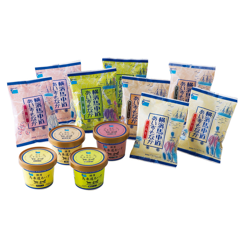 横濱馬車道あいすもなか65ml(ミルク・抹茶・小豆・チョコレート×各2個)、横濱馬車道あいす110ml(カスタード・渋皮栗・みるく大納言・緑茶みるく×各1個)、TBW2Y