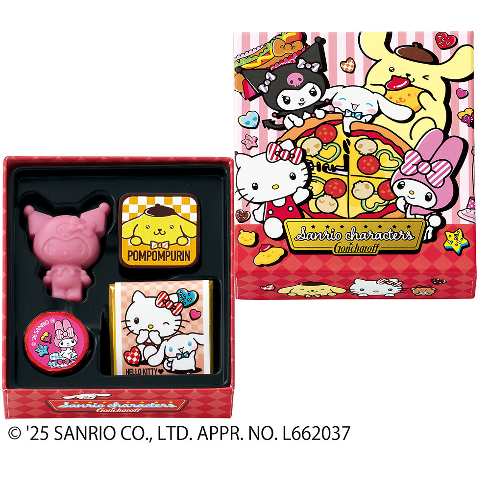 クロミ・マイメロディ・ポムポムプリン・ハローキティ・シナモロールのチョコレートを詰合せたミニボックス。