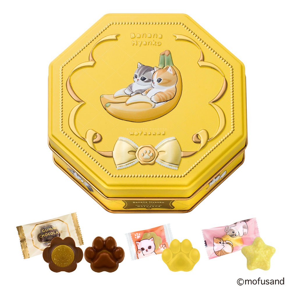 八角形のエンボス缶に、バナナ風味の肉球型グミチョコレート、クランチ、肉球型グミをアソートしました