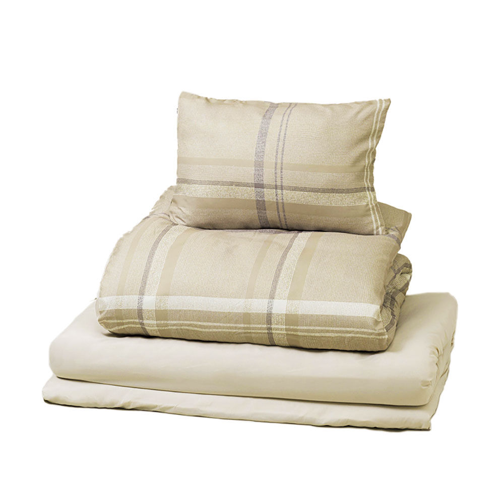 掛布団表地ポリエルテル100%、中綿ポリ綿1.2㎏、裏地ポリエステル100%・敷布団表地ポリエステル100%、中綿ポリ綿3.0㎏、裏地ポリエステル100%・枕表地ポリエステル100%、中綿ポリ綿0.5㎏、裏地ポリエステル100%・掛カバー・ワンタッチシーツ・枕カバー素材ポリエステル100%