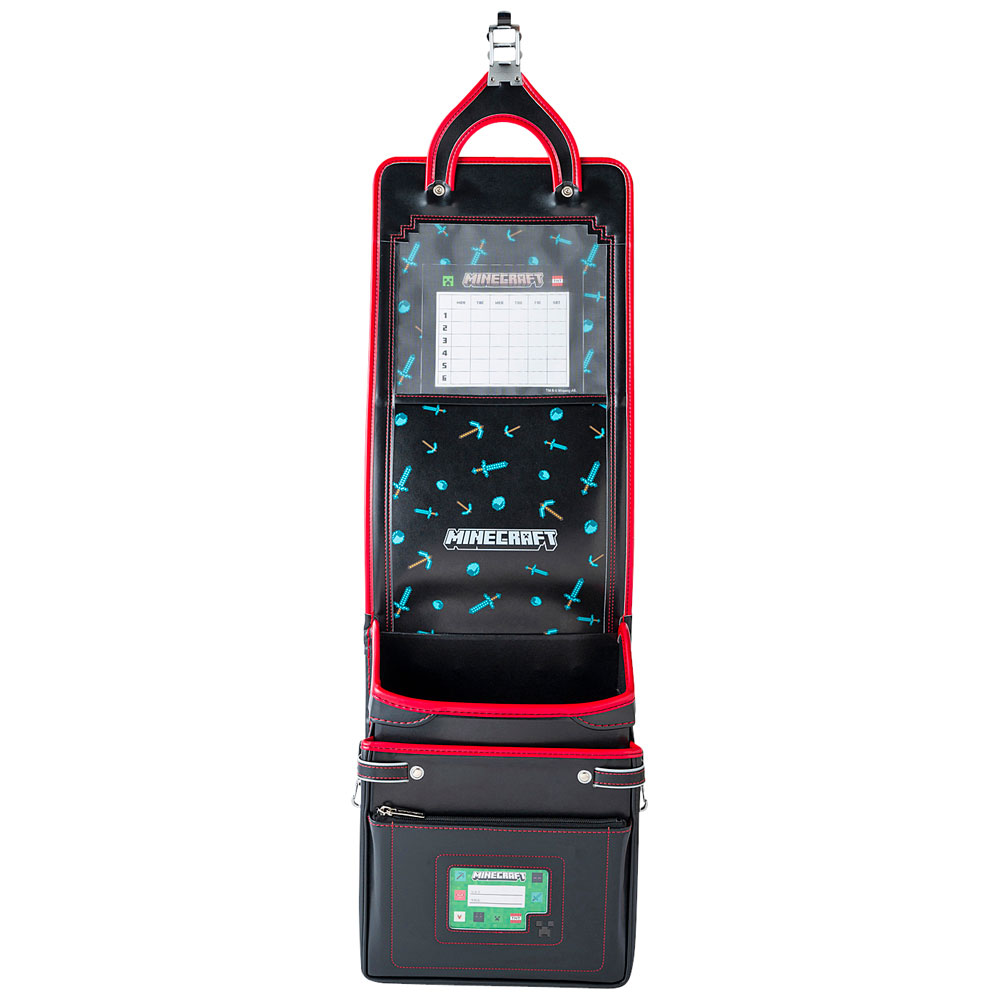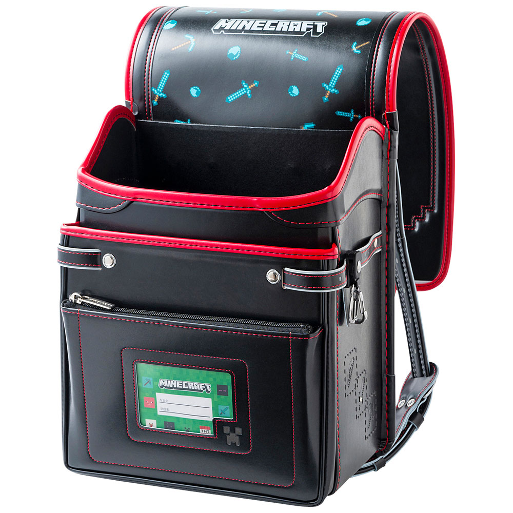 マインクラフトの人気アイテム「ダイヤモンドつるはし」と「ダイヤモモンド剣」をかぶせ裏にプリントし、ランドセルを開けた時に広がるマインクラフトワールドを表現した楽しいランドセルです。