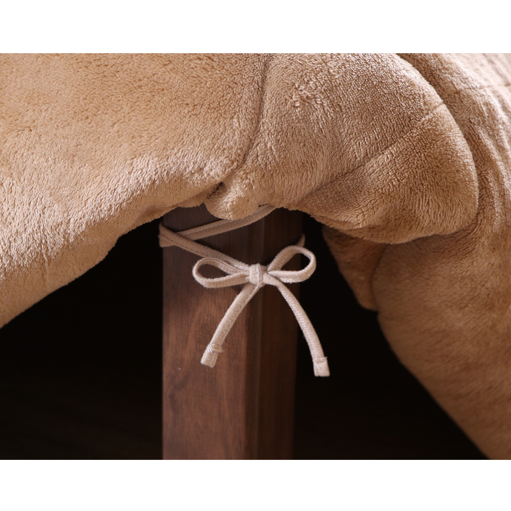 表地は凹凸感のある細かな格子状の模様になっており無地色なので落ち着いた印象のこたつ布団になっております。裏地にはなめらかな肌触りのフランネルを使用しています。薄手なので折りたたんでもかさばらず、コンパクトに収納できます。布団の内側に紐をつけることにより、布団と台がずれないようにしました。部分暖房のコタツは電気代もおトクです。