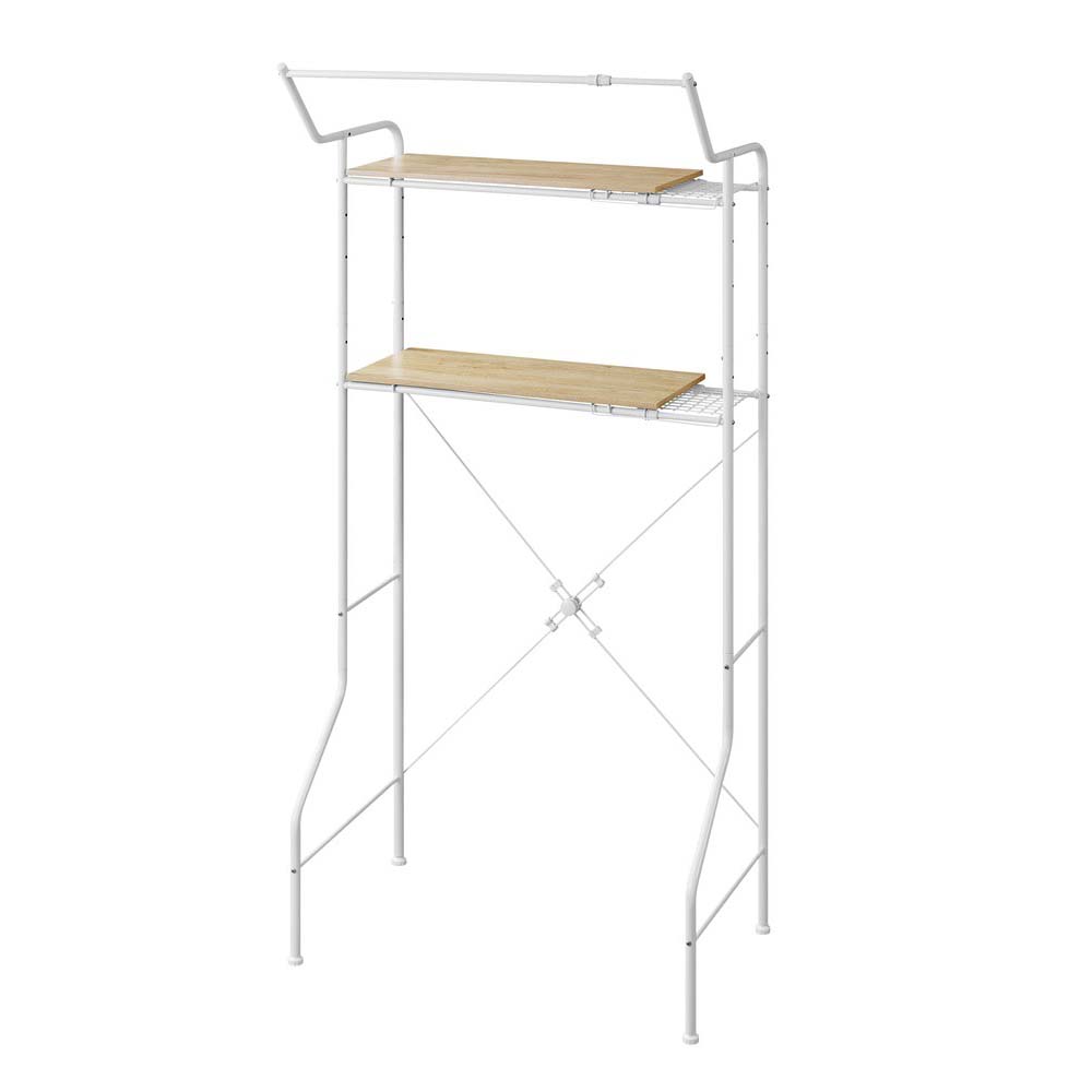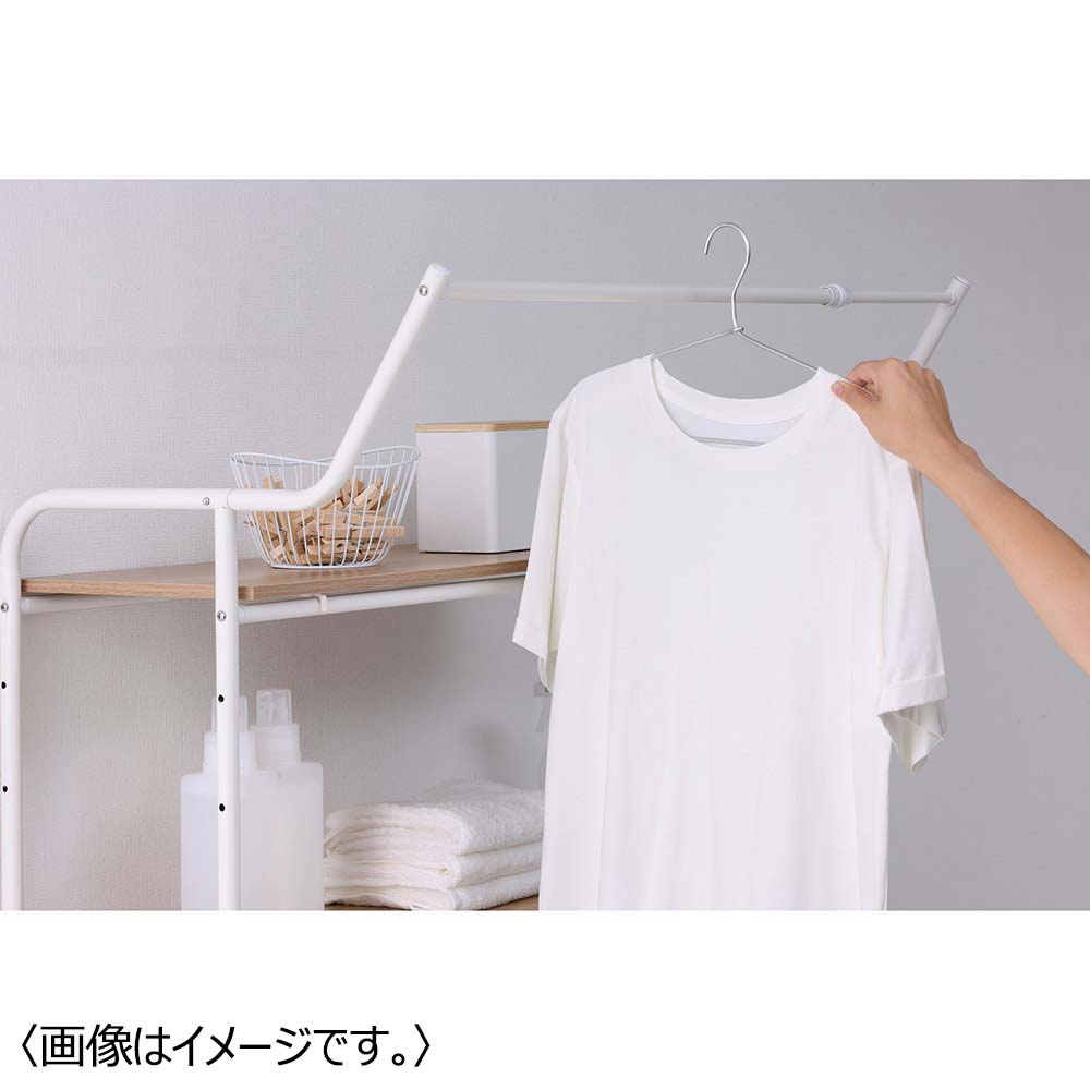 ハンガーバー付きのシンプルなデザインのスタイルランドリーラックです。ハンガーバーはバスマットやバスタオル、洗濯物のちょい干し、ちょい掛けなどに便利です。設置場所に合わせてサイズ調節ができる幅伸縮タイプです。インテリアに馴染む木目調の棚板は、ランドリー周りをおしゃれに収納できます。約9cm間隔で6段階、収納物に合わせて高さ調整が可能です。棚板とワイヤーラックの組合せにより、伸長して使用した場合でも物が置けます。脚部アジャスターにより、がたつきを防止しています。付属している大きい脚部アジャスターを使用することで、防水パンが壁面に近いご家庭でも設置できます。お客様組み立てとなります。