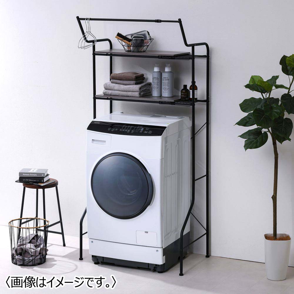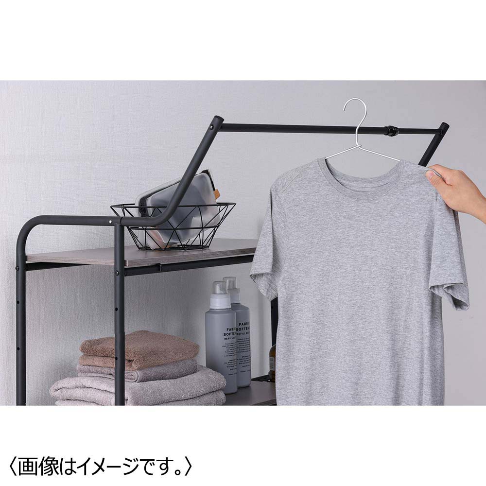 ハンガーバー付きのシンプルなデザインのスタイルランドリーラックです。ハンガーバーはバスマットやバスタオル、洗濯物のちょい干し、ちょい掛けなどに便利です。設置場所に合わせてサイズ調節ができる幅伸縮タイプです。インテリアに馴染む木目調の棚板は、ランドリー周りをおしゃれに収納できます。約9cm間隔で6段階、収納物に合わせて高さ調整が可能です。棚板とワイヤーラックの組合せにより、伸長して使用した場合でも物が置けます。脚部アジャスターにより、がたつきを防止しています。付属している大きい脚部アジャスターを使用することで、防水パンが壁面に近いご家庭でも設置できます。お客様組み立てとなります。