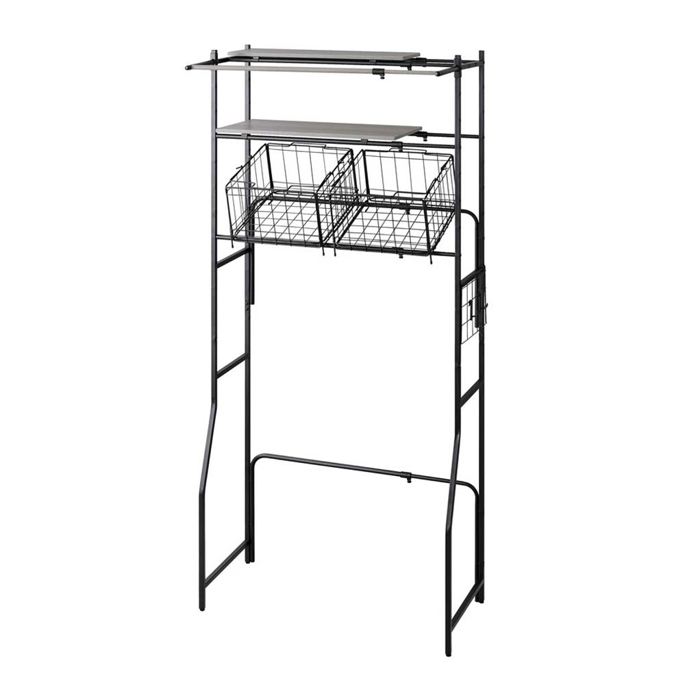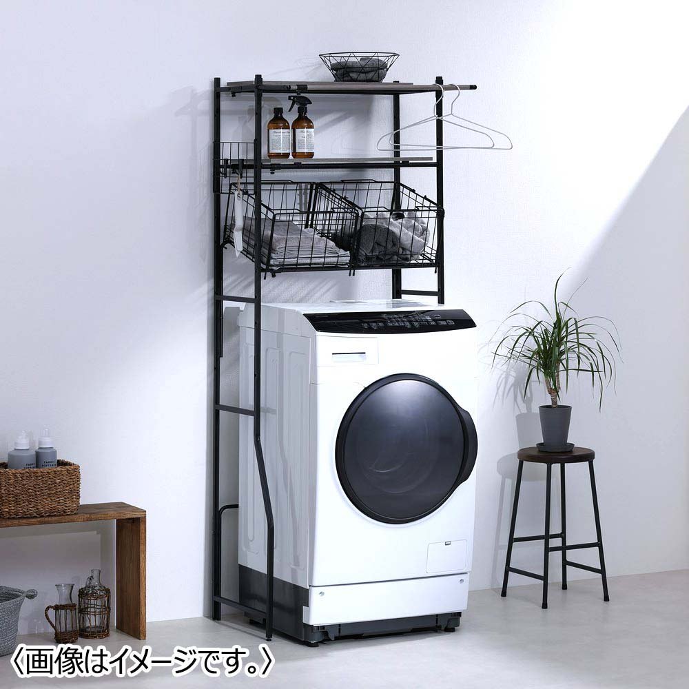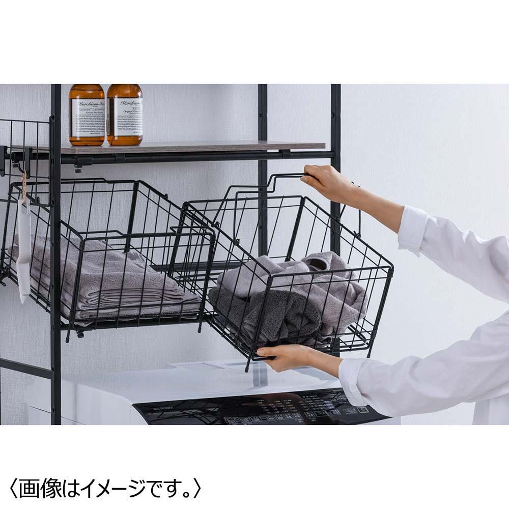 バスケット付きのシンプルなデザインのスタイルランドリーラックです。設置場所に合わせてサイズ調節ができる幅伸縮タイプです。インテリアに馴染む木目調の棚板は、ランドリー周りをおしゃれに収納できます。約8cm間隔で6段階、収納物に合わせて高さ調整が可能です。バスケットは洗濯物の仕分けやタオルの収納などに便利です。取り付け方は平行と斜めの2通りです。ハンガーバーはバスマットやバスタオル、洗濯物のちょい干し、ちょい掛けなどに便利です。フック付きのメッシュパネルは小物を掛けて収納できます。左右どちらにも取り付けられます。アジャスター付きで、ガタつきを防止します。お客様組み立てとなります。