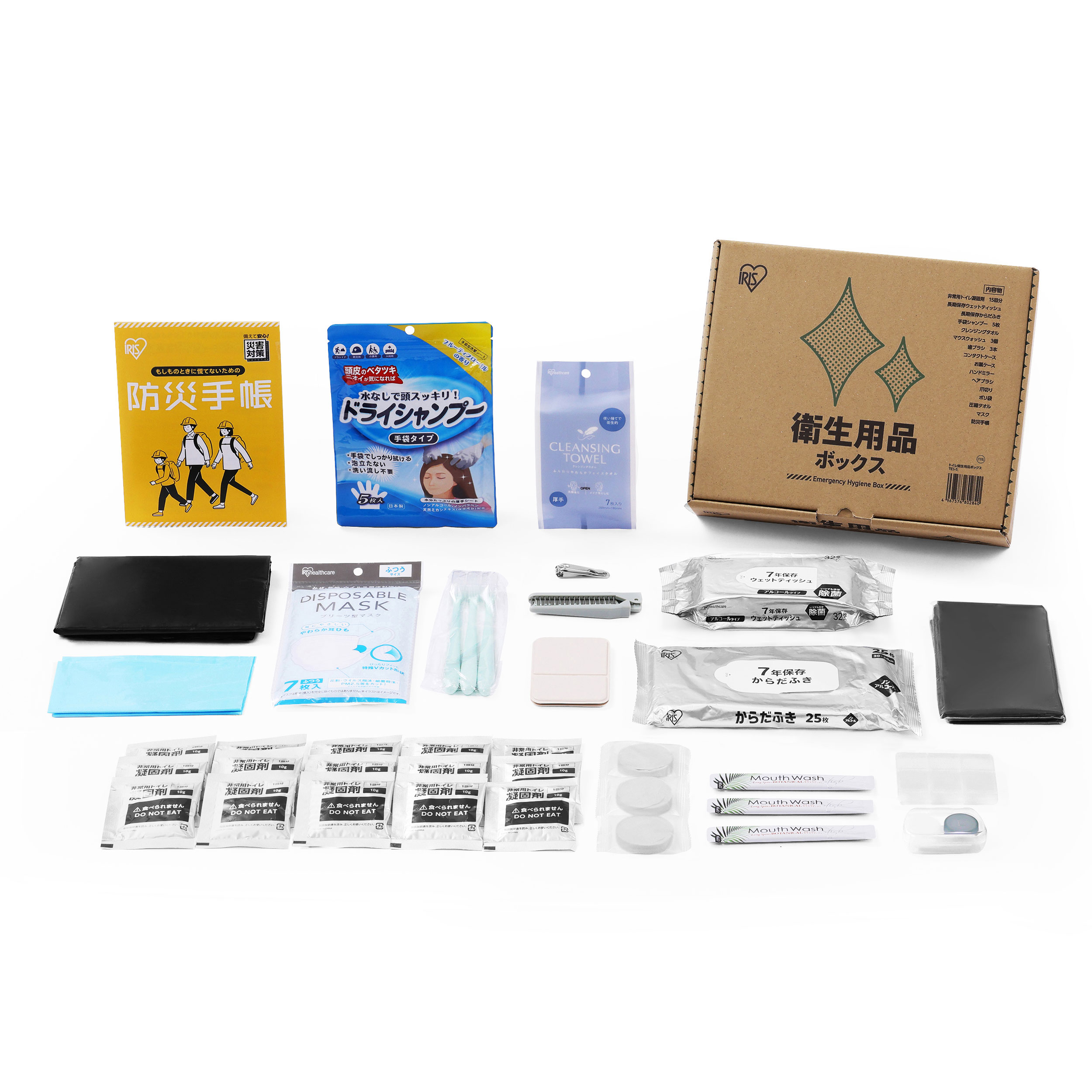 災害時の避難生活に必要な断水時のトイレ対策、お風呂対策、口腔ケアができる用品が1箱で揃う衛生用品ボックスです。